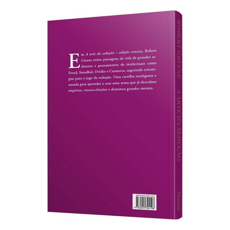 EDIÇÃO CONCISA. Nova edição resumida com as principais ideias do livro de Robert Greene, também autor de 48 Leis do Poder, best seller da lista dos mais vendidos da Veja. Quando nos apaixonamos, caímos numa espécie de encantamento. Nossa mente, em geral preocupada com seus próprios problemas, só pensa no ser amado. O ser hipnotizado se rende à vontade daquele que o seduziu. Sedutores são aquelas pessoas que sabem o tremendo poder contido nestes momentos de entrega absoluta. A arte da sedução – edição concisa, escrita por Robert Greene e em colaboração com o designer Joost Elffers, dá ao leitor a oportunidade de aprender o legado dos maiores sedutores da civilização – de John F. Kennedy a Napoleão Bonaparte, de Pablo Picasso a Cleópatra. Para Greene, o ato de seduzir é racional e pode ser desenvolvido. Para isso, é necessário conhecer suas próprias características sedutoras. Depois, é fundamental estudar a vítima que será seduzida.Nove tipos compõem o painel de sedutores-chave descrito por Robert Greene. E o autor propõe o autoconhecimento como meta para que o potencial de sedução se realize plenamente. Depois de mapear as personalidades mais marcantes, o autor instrui como agir para que a vítima se renda total e incondicionalmente. A grande vantagem de um trabalho resumido é que ele vai direto ao ponto. As citações e comentários de célebres pensadores sobre o assunto se mantiveram. O leitor pode se deliciar com as frases, comentários e exemplos de filósofos e escritores como Ovídio, Nietzsche, Plutarco, Soren Kierkegaard, Sthendal e Virginia Woolf. O texto irônico e divertido de Robert Greene constrói um manual de estratégia para aqueles que desejam se aprimorar na arte da conquista amorosa. E que será útil também em outros setores da vida nos quais a sedução é fundamental. Leia também 33 estratégias de Guerra do mesmo autor.
