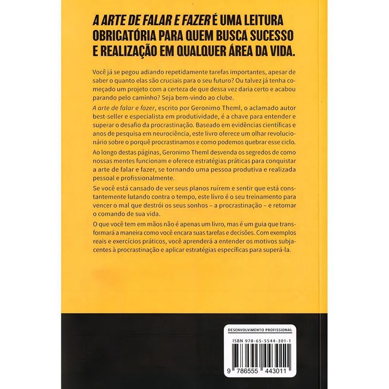 VOCÊ NASCEU PARA SER UM REALIZADOR E NÃO UM PROCRASTINADOR! DO AUTOR BEST-SELLER COM MAIS DE 100 MIL LIVROS VENDIDOS! Você já se pegou adiando repetidamente tarefas importantes, apesar de saber o quanto elas são cruciais para o seu futuro? Ou talvez já tenha começado um projeto com a certeza que dessa vez daria certo e acabou parando pelo caminho? A arte de falar e fazer, escrito por Geronimo Theml, o aclamado autor best-seller e especialista em produtividade, é a chave para entender e superar o desafio da procrastinação. Baseado em evidências científicas e anos de pesquisa em neurociência, este livro oferece um olhar revolucionário sobre o porquê procrastinamos e como podemos quebrar o ciclo. Aqui, Geronimo desvenda os segredos de como nossas mentes funcionam e oferece estratégias práticas para conquistar a arte de falar e fazer, se tornando uma pessoa produtiva e realizada pessoal e profissionalmente. Com exemplos reais e exercícios práticos, você aprenderá a entender os motivos subjacentes à procrastinação e aplicar estratégias específicas para superá-la. Se você está cansado de ver seus planos ruírem e sentir que está constantemente lutando contra o tempo, este livro é o seu treinamento para vencer a procrastinação e retomar o comando de sua vida. “A arte de falar e fazer é uma leitura obrigatória para quem busca sucesso e realização em qualquer área da vida.”