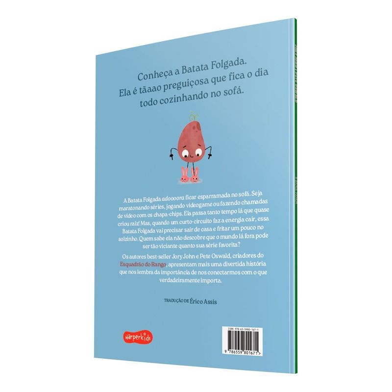 Conheça a Batata Folgada, a mais preguiçosa e sossegada de todas. A Batata Folgada ama passar o dia vidrada em todas as suas telinhas vendo séries, jogando videogames e conversando com os amigos. Ela tem tudo que poderia querer a um clique de distância, não precisa nem sair do sofá. Mas, quando a luz acaba, essa batatinha preguiçosa é forçada a se afastar do conforto de casa e se aventurar ao ar livre. Será que o ar fresco e a luz do sol vão convencê-la a se descascar mais do sofá? Dos autores best-seller do New York Times Jory John e Pete Oswald, os mesmos criadores de O feijão maneiro e O ovo bonzinho, esta é uma história divertida que ensina as crianças a respeito da importância de se desconectar um pouco das telas e se reconectar com o mundo real e a natureza.