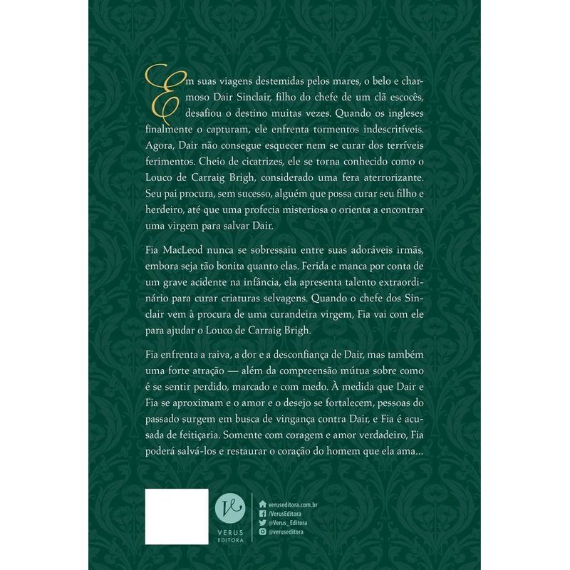 Duas almas feridas e uma paixão arrebatadora nas Terras Altas. Em A bela e o highlander, o belo e charmoso Dair Sinclair, filho do chefe de um clã escocês, em suas viagens destemidas pelos mares, desafiou o destino muitas vezes. Quando os ingleses finalmente o capturam, ele enfrenta tormentos indescritíveis. Agora, Dair não consegue esquecer nem se curar dos terríveis ferimentos. Cheio de cicatrizes, ele se torna conhecido como o Louco de Carraig Brigh, considerado uma fera aterrorizante. Seu pai procura, sem sucesso, alguém que possa curar seu filho e herdeiro, até que uma profecia misteriosa o orienta a encontrar uma virgem para salvar Dair.Fia MacLeod nunca se sobressaiu entre suas adoráveis irmãs, embora seja tão bonita quanto elas. Ferida e manca por conta de um grave acidente na infância, ela apresenta talento extraordinário para curar criaturas selvagens. Quando o chefe dos Sinclair vem à procura de uma curandeira virgem, Fia vai com ele para ajudar o Louco de Carraig Brigh.Fia enfrenta a raiva, a dor e a desconfiança de Dair, mas também uma forte atração — além da compreensão mútua sobre como é se sentir perdido, marcado e com medo. À medida que Dair e Fia se aproximam e o amor e o desejo se fortalecem, pessoas do passado surgem em busca de vingança contra Dair e Fia é acusada de feitiçaria. Somente com coragem e amor verdadeiro, Fia poderá salvá-los e restaurar o coração do homem que ela ama… “Gostei muito deste livro. Uma leitura rápida, bem ritmada e interessante. Foi assustador, emocionante e romântico, praticamente tudo que você poderia esperar de um romance highlander. Recomendo com certeza.” – Rebecca Book Review“Uma história única… Passei a maior parte do tempo entretida, incrédula e ansiosa pelo que aconteceria a seguir.” – Smexy Books“Este livro falou com todas as partes românticas da minha alma.” – Sportochick’s Musings“Majestoso e lindamente narrado. Mal posso esperar pelo próximo conto de fadas de Cornwall!” – Addicted to Romance“Fiquei fascinada da primeira à última página!” – Angel’s Guilty Pleasures