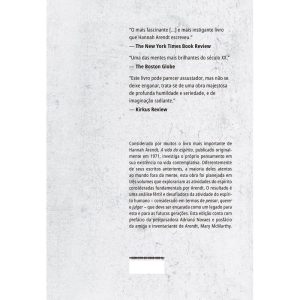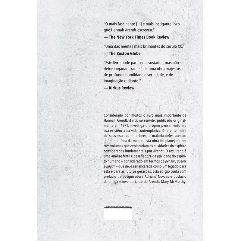 Último livro de Arendt complementa a reflexão sobre a existência humana e levanta argumentos para responder questões sobre sua origem, dimensão temporal e o que nos faz pensar. A vida do espírito, último trabalho de Hannah Arendt, interrompido com sua morte, em 1975, apresenta um exame das atividades espirituais do pensar, do querer e do julgar, que se organiza em três volumes, reunidos neste único livro. A obra ocupa-se do indivíduo, ao considerar os aspectos da sua existência menos condicionados por sua presença do mundo. Assim, cada uma dessas três atividades depende de uma espécie de retirada espiritual do contato direto com as coisas do mundo, o que constitui a condição para que se possa refletir e discorrer sobre elas.Desse modo, o volume sobre o pensar recorre a um extenso material para responder a questões sobre a posição dessa atividade diante do mundo das aparências, sobre a sua origem (o que nos faz pensar?) e sobre a dimensão temporal em que se move o sujeito pensante. O volume dedicado ao querer revê a pré-história da noção de vontade na filosofia antiga, examina a descoberta dessa faculdade no período cristão e a posição central ocupada por ela na filosofia moderna, sublinhando o questionamento dessa centralidade na filosofia contemporânea. A essa altura, chama a atenção para que a necessidade de se definir uma noção de liberdade que abrigue um significado político. O volume sobre o julgar não pôde ser realizado. Mary McCarthy, amiga e inventariante de Arendt, então, decidiu suprir essa lacuna com a inclusão de excertos de cursos da autora sobre a filosofia de Kant, na qual ela esperava encontrar as fontes para o exame da faculdade de julgar.Mesmo tendo sido escrito para um público de estudantes de filosofia, A vida do espírito foi redigido no estilo sempre vivo e muito fluente característico de Arendt, o que faz com que desperte a atenção de um público muito mais amplo, interessado nos debates intelectuais mais relevantes da contemporaneidade. A excelente tradução, feita há mais de uma década por um grupo de estudiosos, foi revista nesta edição. “Uma das mentes mais brilhantes do século XX.” — The Boston Globe“Este livro pode parecer assustador, mas não se deixe enganar, trata-se de uma obra majestosa de profunda humildade e seriedade, e de imaginação radiante.” — Kirkus Review“O mais fascinante […] e mais instigante livro que Hannah Arendt escreveu” — The New York Times Book Review