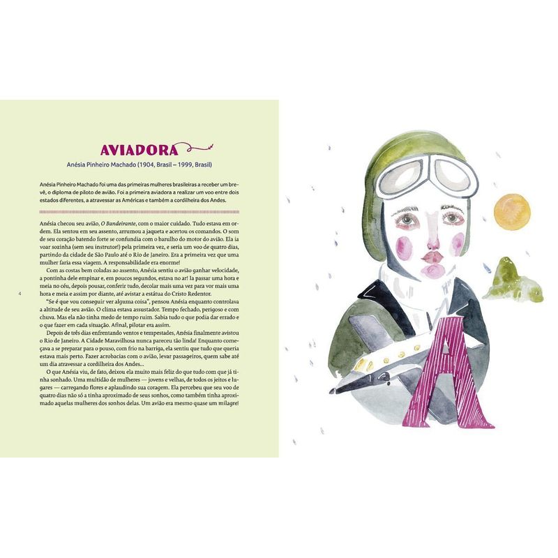 “Conheça a vida de mulheres pioneiras em diferentes profissões neste livro ilustrado e empoderador. Este é um livro abecedário muito diferente. A cada letra, o leitor vai conhecer histórias raras e valiosas de mulheres que revolucionaram seus campos de atuação. Foram essas heroínas do dia a dia que contribuíram para que as mulheres de hoje pudessem trabalhar em diferentes áreas, mesmo em profissões que um dia foram consideradas “masculinas”. Cada história biográfica é apresentada na forma de um pequeno conto muito bem-humorado acompanhado de lindas ilustrações que homenageiam as mulheres retratadas. O leitor será convidado a descobrir a história da aviadora brasileira Anésia Pinheiro Machado, da bióloga inglesa Margaret Elizabeth Fountaine, da chef de cozinha francesa Eugénie Brazier e de tantas outras profissionais incríveis.”