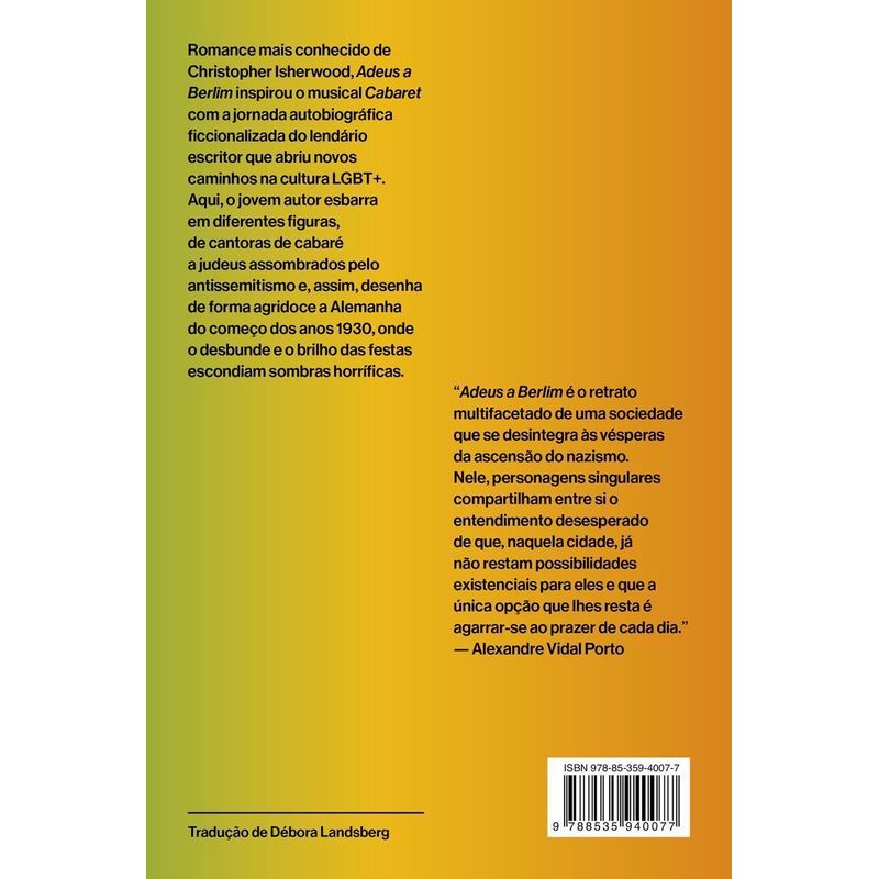Romance mais conhecido de Christopher Isherwood, Adeus a Berlim traz a jornada autobiográfica ficcionalizada do lendário escritor que abriu novos caminhos na cultura LGBT+. Um retrato agridoce da Alemanha do começo dos anos 1930, onde o desbunde e o brilho das festas escondiam sombras horríficas. Em 1929, o escritor britânico Christopher Isherwood viajou por dez dias a Berlim, onde esperava encontrar a liberdade sexual ausente em sua terra natal. O curto período que passou na Alemanha foi tão impactante que decidiu se mudar de vez para lá em novembro do mesmo ano. Sua vivência na época da República de Weimar inspirou Adeus a Berlim, obra semiautobiográfica que pincela diferentes personagens da cidade efervescente enquanto a ameaça nazifascista crescia a olhos vistos. As diferentes criaturas que cruzam o caminho do protagonista — uma dona de pensão fofoqueira, uma família de judeus endinheirada, sob o risco crescente do antissemitismo, e, por fim, um homem enciumado com a atenção que o namorado recebe nas noites da cidade — ajudam a compor um panorama no qual a melancolia é escondida por uma frágil fachada de coquetéis e cabarés.