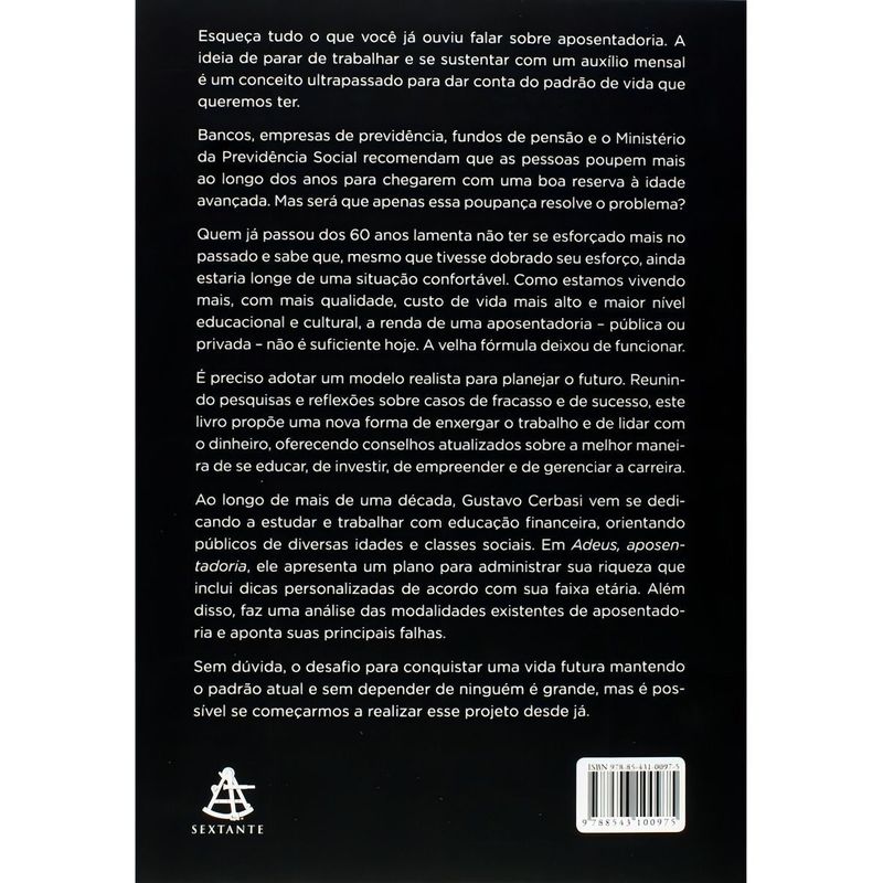Esqueça tudo o que você já ouviu falar sobre aposentadoria. A ideia de parar de trabalhar e se sustentar com um auxílio mensal é um conceito ultrapassado para dar conta do padrão de vida que queremos ter. Bancos, empresas de previdência, fundos de pensão e o Ministério da Previdência Social recomendam que as pessoas poupem mais ao longo dos anos para chegarem com uma boa reserva à idade avançada. Mas será que apenas essa poupança resolve o problema? Quem já passou dos 60 anos lamenta não ter se esforçado mais no passado e sabe que, mesmo que tivesse dobrado seu esforço, ainda estaria longe de uma situação confortável. Como estamos vivendo mais, com mais qualidade, custo de vida mais alto e maior nível educacional e cultural, a renda de uma aposentadoria – pública ou privada – não é suficiente hoje. A velha fórmula deixou de funcionar. É preciso adotar um modelo realista para planejar o futuro. Reunindo pesquisas e reflexões sobre casos de fracasso e de sucesso, este livro propõe uma nova forma de enxergar o trabalho e de lidar com o dinheiro, oferecendo conselhos atualizados sobre a melhor maneira de se educar, de investir, de empreender e de gerenciar a carreira. Ao longo de mais de uma década, Gustavo Cerbasi vem se dedicando a estudar e trabalhar com educação financeira, orientando públicos de diversas idades e classes sociais. Em Adeus, aposentadoria, ele apresenta um plano para administrar sua riqueza que inclui dicas personalizadas de acordo com sua faixa etária. Além disso, faz uma análise das modalidades existentes de aposentadoria e aponta suas principais falhas. Sem dúvida, o desafio para conquistar uma vida futura mantendo o padrão atual e sem depender de ninguém é grande, mas é possível se começarmos a realizar esse projeto desde já.