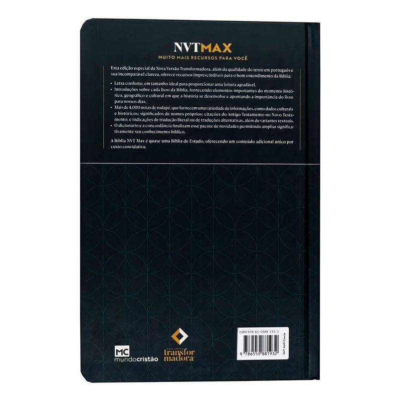 NVT MAX — Muito mais recursos para você Esta edição especial da Nova Versão Transformadora, além da qualidade do texto em português e sua incomparável clareza, oferece recursos imprescindíveis para o bom entendimento da Bíblia: Letra conforto, em tamanho ideal para proporcionar uma leitura agradável. Introduções sobre cada livro da Bíblia, fornecendo elementos importantes do momento histórico, geográfico e cultural em que a história se desenvolve e apontando a importância do livro para nossos dias. Mais de 4.000 notas de rodapé, que fornecem uma variedade de informações, como dados culturais e históricos; significados de nomes próprios; citações do Antigo Testamento no Novo Testamento; e indicações de tradução literal ou de traduções alternativas, além de variantes textuais. O dicionário e a concordância finalizam esse pacote de novidades permitindo ampliar significativamente seu conhecimento bíblico. A Bíblia NVT Max é quase uma Bíblia de Estudo, oferecendo um conteúdo adicional único por custo convidativo. * Edição em capa dura com excelente acabamento, cantos arredondados e borda pintada. *