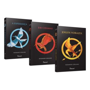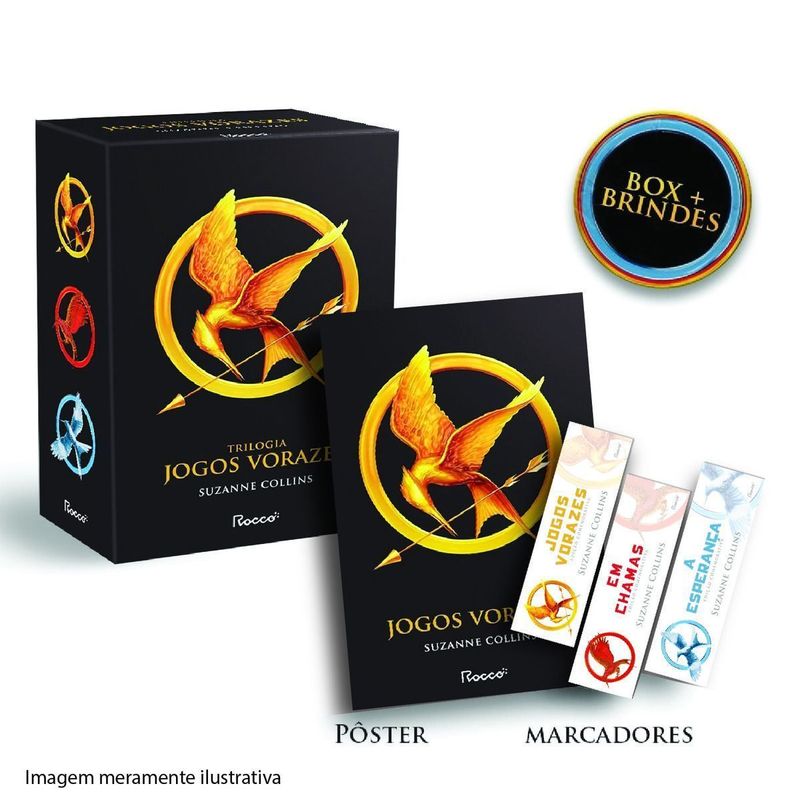 Box rígido com três livros em brochura, com orelha, acompanha um pôster e três marcadores. Ambientada num futuro sombrio, a saga Jogos Vorazes foi pioneira de uma tendência que ganhou força na literatura jovem nos últimos anos: a dos romances distópicos e pós-apocalípticos. A obra rendeu à autora Suzanne Collins lugar na badalada lista de 100 personalidades mais influentes do ano da revista Time antes mesmo de estourar nos cinemas. Inspirada pelo mito grego de Teseu e o Minotauro e pelo que há de melhor na ficção científica, Suzanne Collins faz uma dura crítica à sociedade do espetáculo e prende a atenção do leitor do primeiro ao último livro da saga – composta pelos volumes Jogos Vorazes, Em chamas e A esperança – com uma trama envolvente e perturbadora. Formada por uma suntuosa Capital cercada de 12 distritos periféricos, a nação de Panem se ergueu sobre as ruínas de um lugar anteriormente conhecido como América do Norte. A cada ano, os distritos são forçados a enviar um menino e uma menina com idade entre 12 e 18 anos para participar dos Jogos Vorazes. As regras são simples: os 24 tributos, como são chamados os jovens, são levados a uma gigantesca arena e devem lutar entre si, numa competição transmitida ao vivo para todo o país, até só restar um sobrevivente. O vitorioso, além da glória, leva grandes vantagens para o seu distrito. Quando Katniss Everdeen, de 16 anos, decide participar dos Jogos Vorazes para poupar a irmã mais nova, ela sabe que essa pode ser a sua sentença de morte. Mas a jovem usa toda a sua coragem e suas habilidades para se manter viva e lutar por justiça. As reviravoltas do jogo e as dificuldades enfrentadas pela protagonista a cada etapa levam os leitores a sofrer junto com ela, enquanto descobrem um pouco sobre seu passado e seu relacionamento com Peeta Mellark, o outro tributo enviado pelo Distrito 12 para lutar nos Jogos Vorazes, e sem dúvida fazem de Katniss uma das principais heroínas da literatura jovem dos últimos tempos.