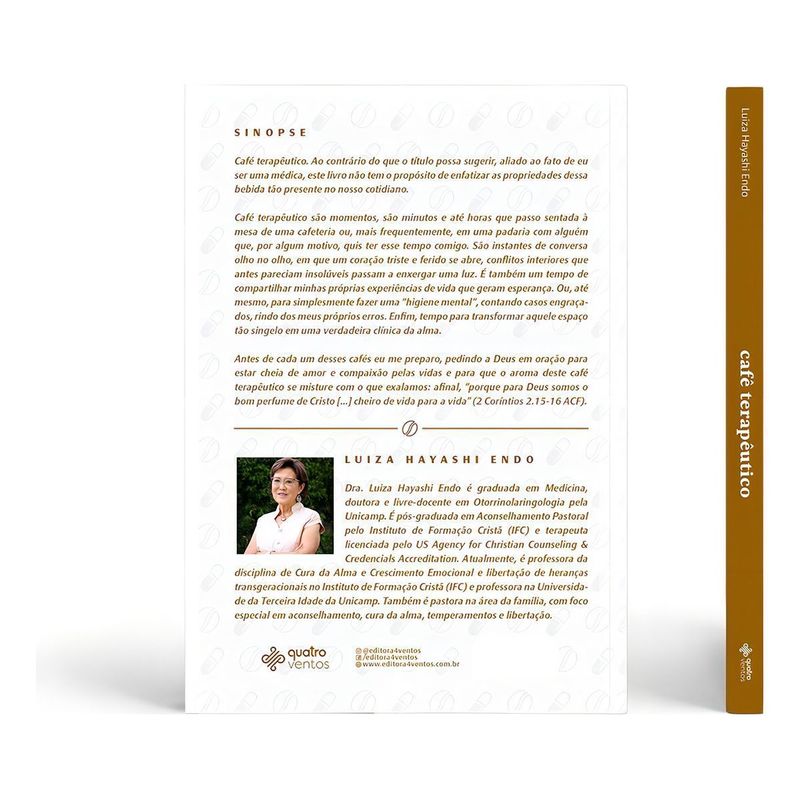 Café terapêutico: ao contrário do que o título possa sugerir, aliado ao fato de eu ser uma médica, este livro não tem o propósito de enfatizar as propriedades dessa bebida tão presente no nosso cotidiano. Na verdade, são momentos, minutos e até horas que passo sentada à mesa de uma cafeteria ou, mais frequentemente, em uma padaria com alguém que, por algum motivo, quis ter esse tempo comigo. São instantes de conversa olho no olho, em que um coração triste e ferido se abre, e conflitos interiores que antes pareciam insolúveis passam a enxergar uma luz. É também a hora de compartilhar minhas próprias experiências de vida que geram esperança. Ou simplesmente fazer uma “higiene mental”, contando casos engraçados e rindo dos meus próprios erros. Enfim, o café terapêutico transforma um momento tão singelo em uma verdadeira clínica da alma. Antes de cada encontro desses, eu me preparo pedindo a Deus em oração para estar cheia de amor e compaixão pelas pessoas, e para que o aroma do café se misture com aquilo que exalamos do Senhor. Afinal, “para Deus somos o bom perfume de Cristo” (2 Coríntios 2.15 – ACF).