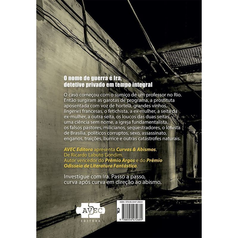 O nome de guerra é Ira, detetive privado em tempo integral. O caso começou com o sumiço de um professor no Rio. Então surgiram as garotas de programa, a prostituta aposentada com voz de hortelã, grandes vinhos, lingeries francesas, o fetichista, a ex-mulher, a seita da ex-mulher, a outra seita, os loucos das duas seitas, uma ciência sem nome, a igreja fundamentalista, os falsos pastores, milicianos, sequestradores, o lobista de Brasília, políticos corruptos, sexo, assassinato, enganos, traições, burrice e outras catástrofes naturais. AVEC Editora apresenta Curvas & Abismos. De Ricardo Labuto Gondim. Autor vencedor do Prêmio Argos e do Prêmio Odisseia de Literatura Fantástica. Investigue com Ira. Passo a passo, curva após curva em direção ao abismo.