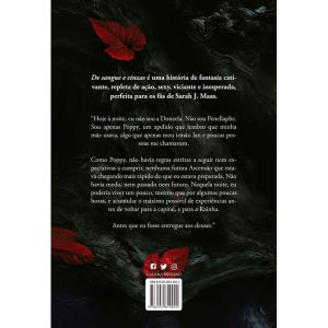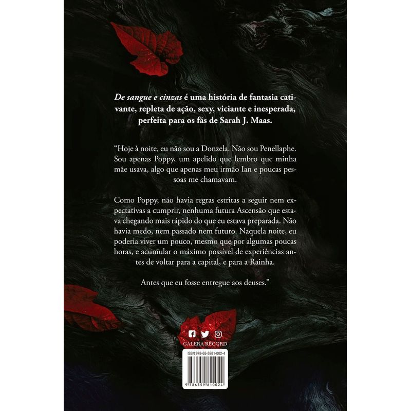 Vencedor do Goodreads Choice Awards 2020 de melhor romance. De sangue e cinzas é uma fantasia sexy, viciante e arrebatadora, perfeita para os fãs de Sarah J. Maas. Prestes a completar 19 anos, Poppy se prepara para sua Ascensão. Quer dizer, Poppy é preparada para sua Ascensão, já que, como tudo mais em sua vida, ela não tem opção senão Ascender. Sendo a Donzela, ela será entregue aos deuses de qualquer forma, seja lá o que isso signifique. Destinada a salvar Solis dos Atlantes, que amaldiçoaram o reino com a criação dos terríveis Vorazes, Poppy não entende o que está por vir e nem sabe se está pronta para ser entregue aos tais deuses ou, ainda, se sequer deseja fazê-lo. Privada de todas as escolhas, sendo inclusive obrigada a cobrir o rosto com um véu e impedida de conversar com qualquer pessoa além de uma dama de companhia designada pela Corte, Poppy leva uma vida solitária. Mas o que ela quer mesmo é lutar ao lado dos guardas e conseguir se proteger das criaturas que ameaçam o reino, as mesmas que mataram seus pais. Com um aliado secreto e uma habilidade rara, Poppy tem um vislumbre da vida que poderia ter se fosse livre do fardo de ser a Donzela. Mas com a entrada de Hawke Flynn em sua vida, o mundo de Poppy vira de cabeça para baixo e ela corre o risco de ser arrebatada por tudo o que sempre lhe disseram ser proibido. Lançada em uma intrincada rede de mentiras, traições e desejo, ela vê todas as suas certezas começarem a ruir. Qual será o lado certo da história? E será que há mesmo um lado certo? Em meio a tantas reviravoltas e dilemas, o futuro de Poppy está cada vez mais incerto e perigoso, e a vida de dois reinos está em suas mãos. Classificação indicativa: 18 anos
