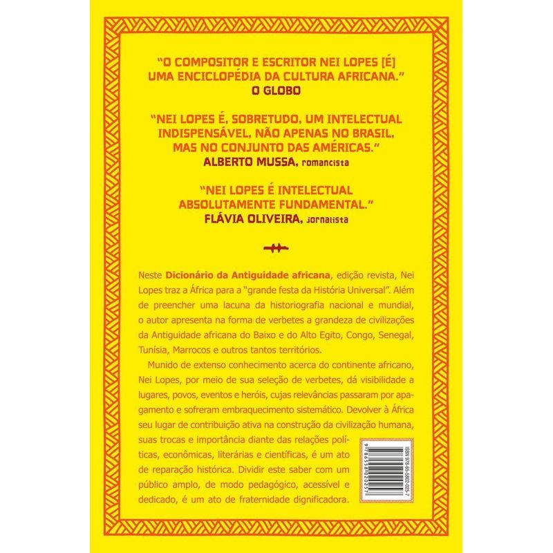 Nesta nova edição de Dicionário da Antiguidade africana, Nei Lopes preenche uma lacuna da historiografia africana, e apresenta de maneira didática e concisa a grandeza de civilizações da Antiguidade africana do baixo e do alto Egito, Congo, Senegal, Tunísia e outros territórios. A contribuição das sociedades negras e africanas para o desenvolvimento de saberes naturais, científicos, culturais e artísticos da humanidade é irrefutável. O apagamento desses conhecimentos, suas raízes e origens, é reflexo do racismo estrutural e de uma História que, brutalmente, se esforçou para ser branca. Felizmente, há o movimento consciente e construtivo de resgate dessas memórias e ciências negras. Nessa tradição, encontra-se este Dicionário da Antiguidade africana, de Nei Lopes.A reedição revista deste livro tornou-se um imperativo no momento em que múltiplos eventos globais vêm abrindo caminho para novos paradigmas de abordagem e reinterpretação da História africana. Porque já não há espaço para a ideia de superioridade da civilização ocidental, baseada na falsa premissa de representação de um estágio mais avançado do desenvolvimento humano, que ao longo dos séculos foi imposta violentamente aos povos de todo mundo. E a inverdade desse argumento é reconhecido desde a decifração, no século XIX, dos hieróglifos da Pedra de Rosetta, que comprovam a anterioridade do conhecimento científico no continente africano, a partir do Egito, em relação às sociedade greco-latinas.Assim, descerra um panorama que se abre há mais de quatro milênios, com o surgimento dos primeiros Estados africanos. Esses reinos, do baixo e do alto Egito, estenderam seu poder até a Núbia, região hoje pertencente às republicas do Sudão e Sudão do Sul, vizinhas da Etiópia e da Somália – países também protagonistas notórios de percursos históricos determinantes. Além do contexto egípcio-núbio, este dicionário também reporta o passado de regiões que, na Antiguidade, constituíram núcleos de civilizações potentes, como as dos eixos Congo-Angola, Nigéria-Camarões, Senegal-Guiné-Mali, Marrocos-Tunísia-Argélia, Zimbábue-Moçambique, entre outros.Dicionário da Antiguidade africana preenche lacunas históricas, ao enfocar o continente que é o berço do mundo. Com verbetes didáticos, acessíveis e concisos, permite a leitores e leitoras enriquecer seu repertório teórico. Segundo Nei Lopes, o principal objetivo desta obra é trazer a África para a “grande festa da História Universal”, em um clima de diálogo e respeito mútuo, sem qualquer pretensão à hegemonia. “Centrado nas sociedades africanas que se desenvolveram a partir do século 7º, muito antes da colonização pelos países europeus, a obra pretende preencher uma lacuna nos estudos sobre a história do continente. Dentre os termos revisados estão axiomas como “conhecimento científico”, “incesto real” e “literatura egípcia”, além de nomes como Cleópatra e Nefertite e locais como Alexandria e Saara.” – Revista Cult
