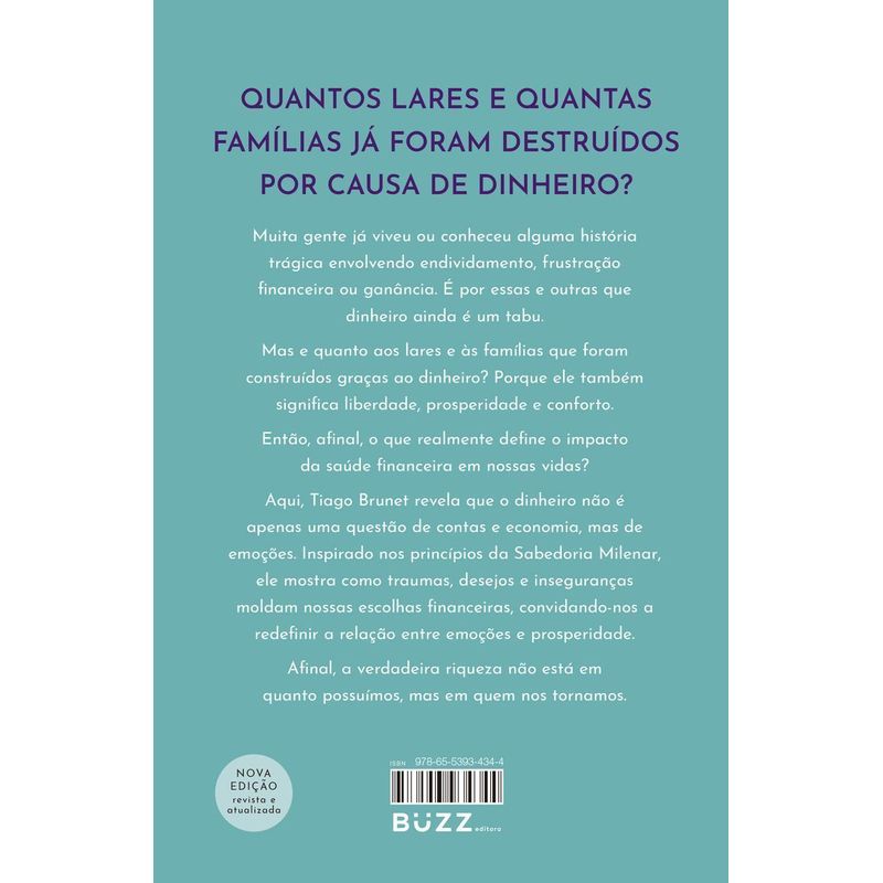 Quantos lares e quantas famílias já foram destruídos por causa de dinheiro? Muita gente já viveu ou conheceu alguma história trágica envolvendo endividamento, frustração financeira ou ganância. É por essas e outras que dinheiro ainda é um tabu. Mas e quanto aos lares e às famílias que foram construídos graças ao dinheiro? Porque ele também significa liberdade, prosperidade e conforto. Então, afinal, o que realmente define o impacto da saúde financeira em nossas vidas? Aqui, Tiago Brunet revela que o dinheiro não é apenas uma questão de contas e economia, mas de emoções. Inspirado nos princípios da Sabedoria Milenar, ele mostra como traumas, desejos e inseguranças moldam nossas escolhas financeiras, convidando-nos a redefinir a relação entre emoções e prosperidade. Afinal, a verdadeira riqueza não está em quanto possuímos, mas em quem nos tornamos.