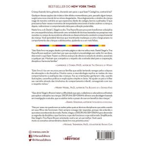 Qualquer dessas opções são inúteis e têm efeitos momentâneos, pois, passado algum tempo, surgirá uma nova crise de birra e stress desgastante… Neurologicamente, o cérebro da criança reage de maneira contrária ao que esperamos diante de castigos, berros e palmadas. O que precisamos fazer nesses momentos de tempestades emocionais é tentar acalmar a criança e, depois, redirecionar o comportamento dela para a direção pretendida. Neste livro, o dr. Daniel J. Siegel e a dra. Tina Payne Bryson procuram transformar a disciplina em uma experiência boa, oferecendo uma variedade de técnicas baseadas nas pesquisas mais recentes no campo da neurociência referente ao desenvolvimento cerebral e comportamental da criança. Você aprenderá técnicas que incentivarão mudanças a curto e longo prazos no comportamento das crianças e adolescentes, ajudando-os a ser mais felizes.