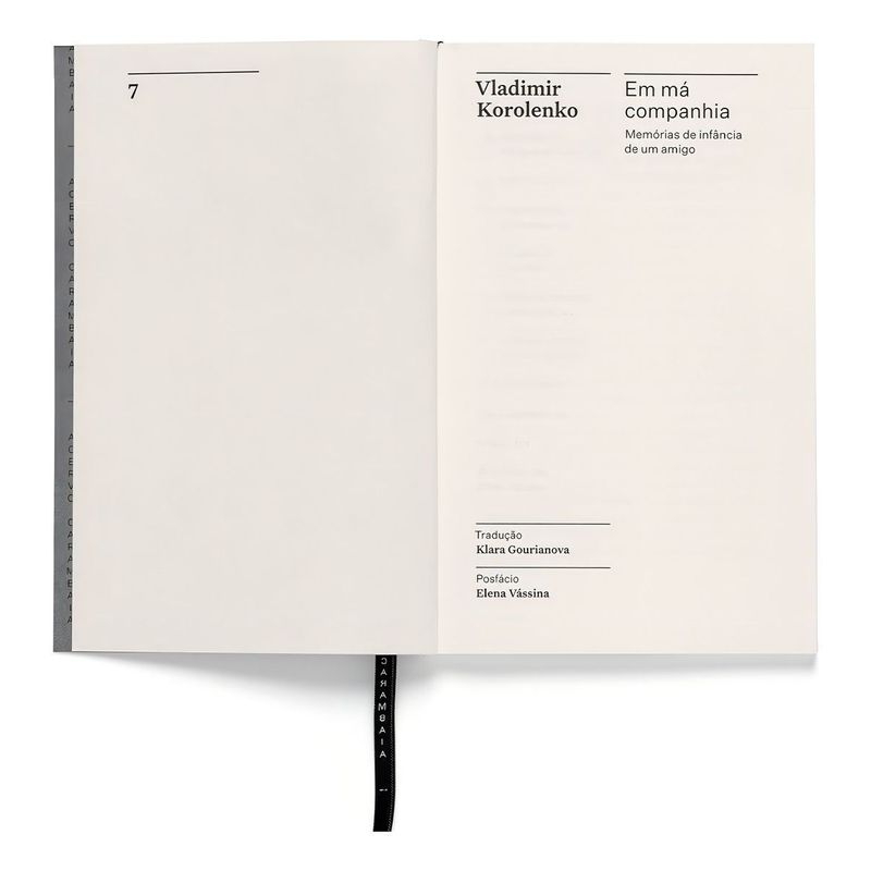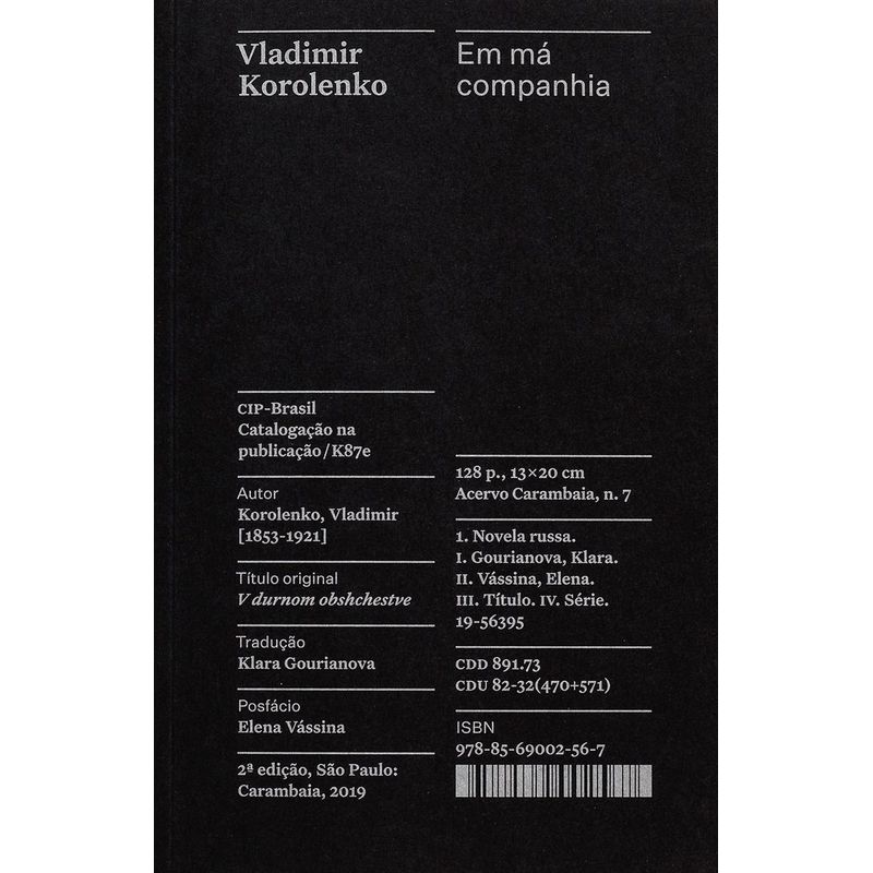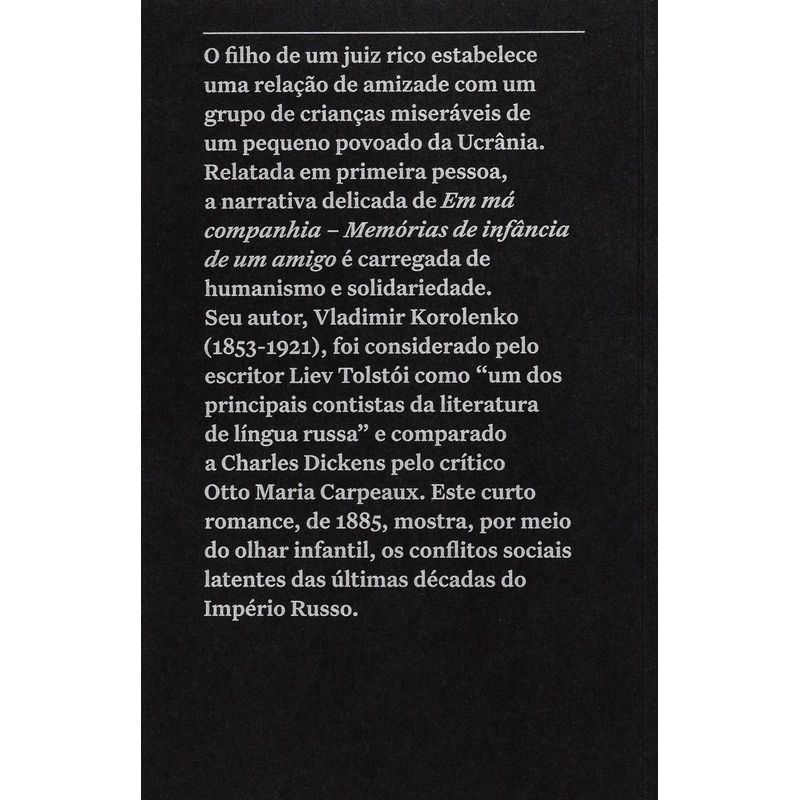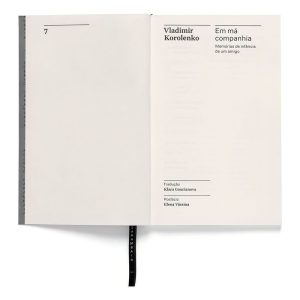 Em má companhia – memórias de infância de um amigo meu é um dos livros essenciais para conhecer melhor a obra de Vladimir Korolenko (1853–1921), considerado por Liev Tolstói “um dos principais contistas da literatura de língua russa” e comparado a Charles Dickens pelo crítico Otto Maria Carpeaux. Korolenko nasceu no sudeste do Império Russo, em Jitómir, atual Ucrânia – uma região multicultural, que passou pelo domínio russo, polonês e ucraniano, onde ele situa essas duas novelas. Com 20 anos, foi estudar em Moscou, onde se envolveu com movimentos estudantis – o que lhe rendeu uma deportação para a Sibéria. Foi lá, durante o exílio, que começou a escrever. Preocupado em denunciar injustiças sociais e sofrimentos humanos, o escritor é considerado um precursor da literatura proletária. Chamado por seus contemporâneos de “consciência de nossa época”, obteve tanto a aceitação popular como a dos meios intelectuais. Em má companhia – memórias de infância de um amigomeu retrata a amizade de um garoto, filho de um juiz rico, que se envolve com uma turma de meninos de outro estrato social. Por meio dessa amizade, o autor aborda sentimentos básicos de compaixão e compartilhamento, temas que sempre estiveram presentes em seus textos. O design da coleção é assinado pelo Bloco Gráfico, constituído por Gabriela Castro, Gustavo Marchetti e Paulo André Chagas. Os livros têm acabamento em brochura, formato 13×20 cm, e utilizam papéis especiais e certificados: o sueco Munken Print Cream 80 g/m2 no miolo e o escocês Pop Set Black 320 g/m2 na capa. Outro detalhe do volume é a inclusão de um fitilho bordado com o logo do Acervo.