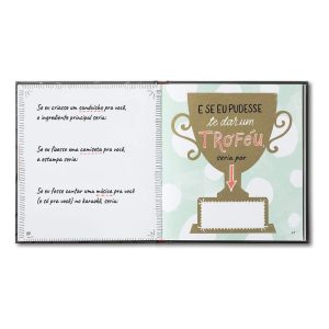 Livro presente em capa dura. Doce, divertido e alegre, um livro para você preencher e dar de presente para quem você ama. Escrevi um livro sobre você é perfeito para quem quer dar um presente com toque pessoal a alguém de que goste muito – pode ser o amor da sua vida, o amigo ou a amiga de todas as horas, seus pais ou parentes, um colega de trabalho. Com ilustrações divertidas e frases cheias de significado, este livro se tornará único quando você – ou um grupo de amigos – completar as páginas com as qualidades mais marcantes de quem vai receber esta lembrança maravilhosa e os momentos inesquecíveis que vocês viveram juntos. Em menos de uma hora e com poucas palavras, você poderá encantar quem seu coração mandar.
