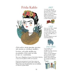 A mexicana Frida Kahlo é hoje uma das artistas mais populares do mundo todo. Seus quadros atingem valores recordes, e seu rosto é reconhecido em todo o planeta. Sua curta vida, entretanto, foi fascinante e cheia de acontecimentos. E não é para menos. Frida teve de lidar desde muito cedo com uma deficiência física congênita, e, adolescente, sofreu o conhecido acidente que quase a matou e a deixou meses numa cama, onde então começou a pintar quadros deitada, muitos deles autorretratos. (…) María Hesse, artista gráfica espanhola, nos brinda aqui com uma lindíssima biografia ilustrada que apresenta, entretecidas, a vida e a obra de Frida Kahlo, incluindo trechos de seus diários, cartas e depoimentos. O livro revela as dores e as delícias de sua existência, mas também como usou a arte para vencer as limitações que as condições lhe impunham e reinventar o próprio existir. O resultado é uma obra poética, lapidar, que dá voz a uma das figuras mais interessantes do século XX.