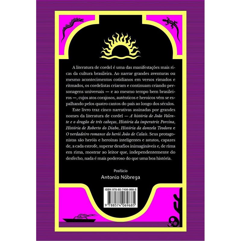 Dragões, desafios e aventuras de tirar o fôlego — há tudo isso e muito mais nessa reunião única de cinco histórias assinadas por grandes nomes da literatura de cordel brasileira. A literatura de cordel é uma das manifestações mais ricas da cultura brasileira. Ao narrar grandes aventuras ou mesmo acontecimentos cotidianos em versos rimados e ritmados, os cordelistas criaram personagens universais — e ao mesmo tempo bem brasileiros —, cujos atos corajosos, autênticos e heroicos vêm se espalhando pelos quatro cantos do país ao longo dos séculos. Com organização da escritora e pesquisadora Januária Alves, ilustrações de Salmo Dansa e posfácio de Antonio Nóbrega, este livro traz cinco narrativas assinadas por grandes nomes da literatura de cordel — A história de João Valente e o dragão de três cabeças, História de Roberto do Diabo, História da imperatriz Porcina, História da donzela Teodora e O verdadeiro romance do herói João de Calais. Seus protagonistas são heróis e heroínas inteligentes e astutos, capazes de, a cada estrofe, superar desafios inimagináveis e, de rima em rima, mostrar ao leitor que, independentemente do desfecho, nada é mais poderoso do que uma boa história. Livro indicado para leitores a partir de 9 anos. “Heróis e heroínas do cordel é um apanhado de histórias que não ficam atrás de nenhuma saga da moda, e que ainda carregam consigo o denso respaldo de Patrimônio Cultural Nacional.” — Mari Bigio, cordelista