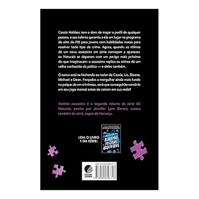 *Os brindes são limitados e válidos somente para a primeira tiragem do livro O segundo volume da série Os Naturais Um thriller repleto de reviravoltas brilhantes, perfeito para fãs da série Criminal Minds, do livro Manual de assassinato para boas garotas e podcasts de true crime Cassie Hobbes, de dezessete anos, tem o dom de traçar perfis de pessoas e por isso garantiu seu lugar no programa Os Naturais, criado em segredo pelo FBI para treinar jovens com talentos extraordinários para trabalhar na resolução de casos arquivados pela polícia. Depois de escapar por pouco de um confronto com um assassino desequilibrado e obcecado pelo assassinato de sua mãe, Cassie espera que ela e o restante da equipe possam se limitar a resolver casos antigos à distância. No entanto, quando vítimas de um novo serial killer começam a aparecer, os Naturais se deparam com um perigo muito próximo: o assassino replica os crimes de um velho conhecido da polícia — e de um deles também. Enquanto isso, Cassie está cada vez mais confusa sobre seus sentimentos pelo leitor de emoções Michael e a crescente ligação com seu colega perfilador Dean. Para completar, o grupo ainda precisa lidar com uma supervisora que deseja fechar o programa. Forçados a mergulhar ainda mais fundo na psiquê de um assassino, será que Cassie, Lia, Sloane, Michael e Dean conseguirão vencê-lo em seu jogo mental antes de caírem em sua rede? Em Instinto assassino, sequência de Academia dos casos arquivados , Jennifer Lynn Barnes manterá os leitores na beira de suas cadeiras (e olhando por cima dos ombros) enquanto correm pelas páginas deste thriller eletrizante.
