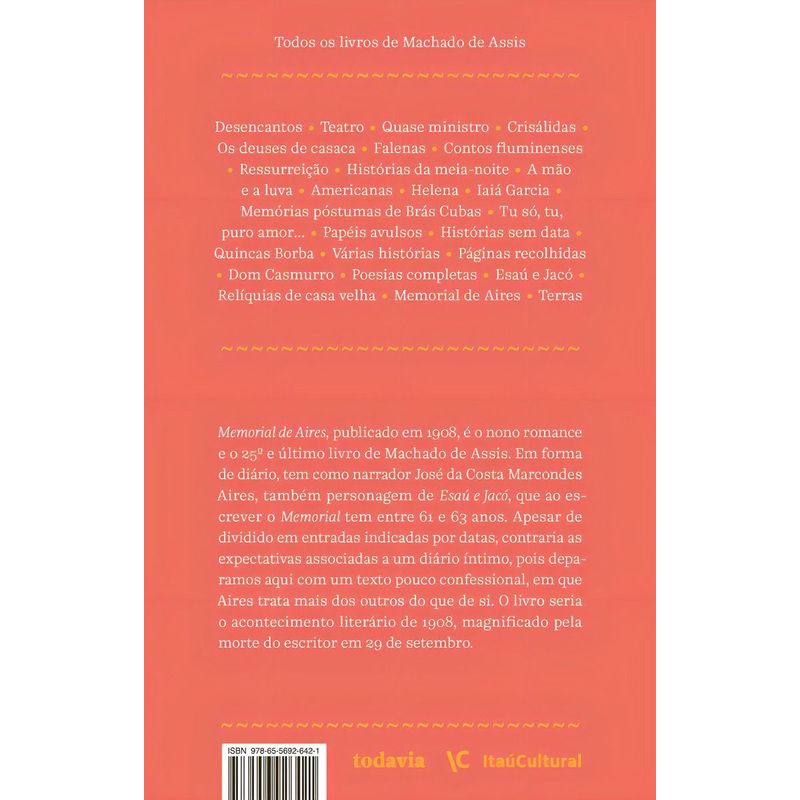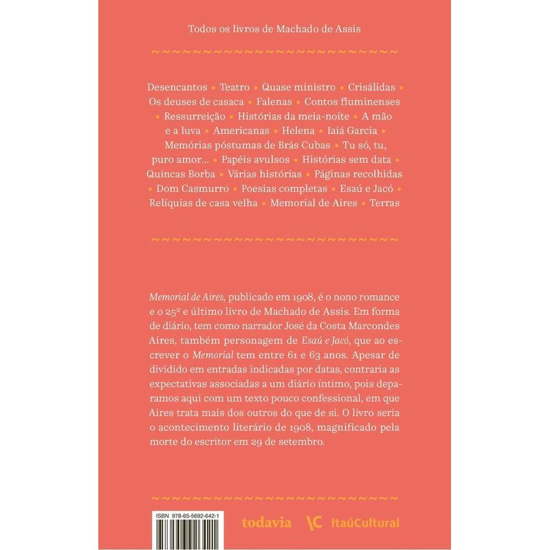 É o nono romance e o 25º e último livro de Machado de Assis. Em forma de diário, é narrado por José da Costa Marcondes Aires, também personagem de Esaú e Jacó, que ao escrever o Memorial tem entre 61 e 63 anos. Apesar de dividido em entradas indicadas por datas, contraria as expectativas associadas a um diário íntimo, pois deparamos aqui com um texto pouco confessional, em que Aires trata mais dos outros do que de si. A obra seria o acontecimento literário de 1908, magnificado pela morte do escritor em 29 de setembro.