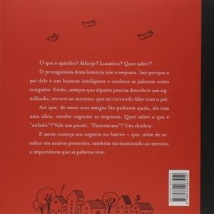 “O protagonista deste livro é um menino que tem muito orgulho de seu pai, um homem culto, inteligente e que conhece as palavras como ninguém. Se os amigos do menino querem saber o significado de alguma palavra, é ao pai dele que sempre recorrem. Quer saber o que é epitélio? Alforje? Lunático? Ele sempre tem uma resposta.A curiosidade dos amigos é tão grande que o menino logo percebe: e se começasse a negociar o significado das palavras? Gorgolão? Vale uma fotografia de um navio de guerra. Enfado? Um sorvete de picolé, trazido pelo dono da sorveteria. Pantomima? Um chiclete. E assim começa seu “negocinho” no bairro, escondido do pai, é claro. ”