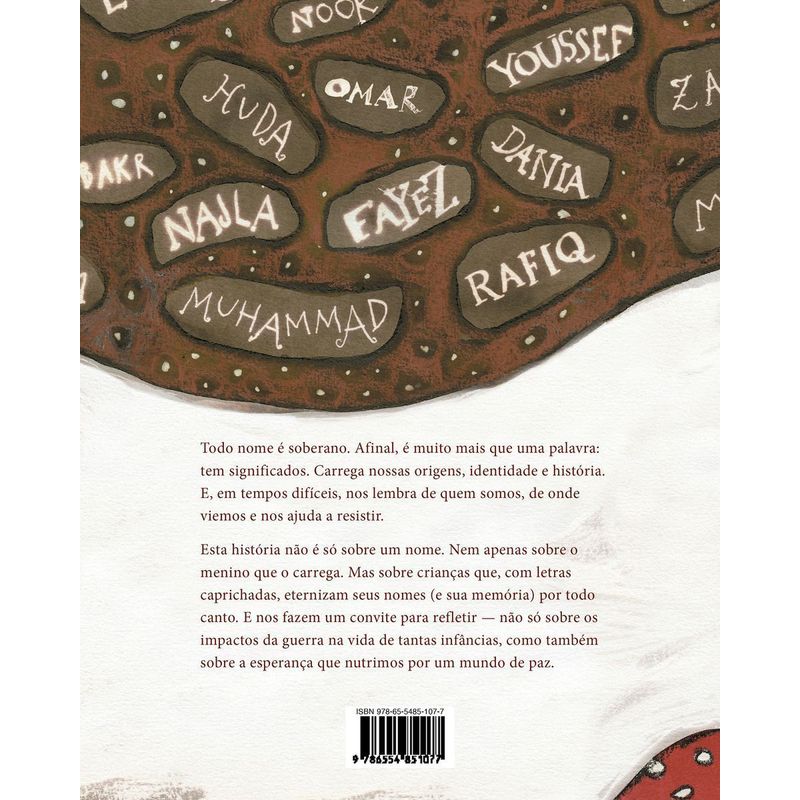 Neste emocionante livro ilustrado, Marilda Castanha propõe uma reflexão delicada sobre identidade, memória e a infância em meio a cenários de guerra. Todo nome é poderoso. Afinal, é mais que uma palavra: tem significados. Nomes carregam nossas origens e nossa memória. E, em tempos difíceis, nos lembram de quem somos, de onde viemos e nos ajudam a resistir. Esta história cuidadosamente elaborada pela premiada Marilda Castanha não é só sobre um nome. Nem apenas sobre o menino que o carrega. Mas um convite para refletirmos sobre os impactos da guerra na vida das crianças, a esperança que nutrimos por um mundo de paz e a importância de não abrirmos mão de nossa identidade e de nossas origens. Indicado para leitores a partir de 6 anos.