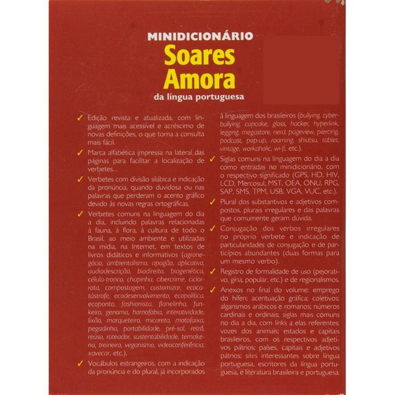 Sucesso absoluto desde o seu lançamento, este Minidicionário é ferramenta indispensável aos estudantes, na sala de aula ou em casa, e a qualquer pessoa que deseja tirar dúvidas ortográficas ou consultar os diferentes sentidos de uma palavra. Esta nova edição, revista e atualizada, traz muitas novidades, acompanhando o dinamismo da língua portuguesa: – linguagem mais acessível, com a inclusão de novas definições, que torna a consulta mais fácil,- inclusão de novas palavras utilizadas na mídia, na linguagem do cotidiano, na Internet, em textos de livros didáticos e informativos, como: agronegócio, apagão, aplicativo, audiodescrição, biogenética, osfera, calçadão, célula-tronco, chapinha, cibercrime, ciclorrota, cracolândia, customizar, decoreba, fashionista, flanelinha, funkeiro, genoma, globalização, hiperconectividade, homofobia, infográfico, interatividade, marqueteiro, micareta, motofaixa, pegadinha, pilates, portabilidade, pré-sal, radiotrânsito, retrô, roteador, saruel, selinho, showmício, temakeria, treineiro, veganismo, videoconferência, viva-voz, xavecar, etc.; – mais vocábulos relacionados à ecologia, como: ambientalismo, biodireito, compostagem, ecocatrástrofe, ecodesenvolvimento, ecopolítica, ecoponto, ecoturismo, lixão, reúso, sustentabilidade, etc.,- siglas comuns na linguagem do dia a dia passam a ser entradas no dicionário, com o respectivo significado: GPS, HD, HIV, LCD, Mercosul, MST, OEA, ONU, RPG, SAP, SMS, TPM, USB, VGA, VUC, etc.,- inclusão de outros estrangeirismos já incorporados à linguagem dos brasileiros: cyberbullying, bullying, cupcake, gloss, hacker, hyperlink, legging, megastore, nerd, pageview, piercing, pin-up, podcast, pop-up, quiche, roaming, scrapbook, shiatsu, skinny, tablet, upgrade, vintage, workaholic, wi-fi, etc.; – atualização dos termos da área de Informática, com o acréscimo de definições,- incorporação de mais expressões idiomáticas e de mais exemplos de uso.Além disso, você também encontra: – Verbetes impressos com destaque colorido. – Marca alfabética impressa na lateral das páginas para facilitar a procura dos verbetes. – Divisão silábica.- Conjugação dos verbos irregulares e particularidades de conjugação na própria entrada do verbo. – Registro de áreas do conhecimento. – Elementos químicos com os respectivos símbolos, números e massa atômicos. – Indicação dos substantivos de dois gêneros, epicenos e sobrecomuns. – Indicação de pronúncias duvidosas e do timbre da vogal tônica ou átona das palavras sem acento gráfico.- Exemplos de uso das expressões e definições mais importantes ou complexas. – Vocabulários estrangeiros e técnico-científicos já incorporados no dia a dia. – Sinônimos e antônimos. – Plural dos substantivos e adjetivos compostos, plurais irregulares e femininos duvidosos. – Superlativos absolutos sintéticos, quando irregulares, duvidosos ou com multiplicidade de formas. – Indicação de regionalismos. – um anexo, ao final do volume, com as regras de acentuação gráfica e do emprego do hífen, conforme o Acordo Ortográfico, coletivos mais usuais, siglas comuns no dia a dia e alguns endereços na internet referentes a elas, verbos que representam a voz dos animais, algarismos arábicos e romanos e números cardinais e ordinais, lista dos estados brasileiros, das capitais e respectivos adjetivos pátrios, relação dos países, adjetivos pátrios e capitais do mundo, endereços de s relacionados à Língua Portuguesa e à Literatura Brasileira e Portuguesa.