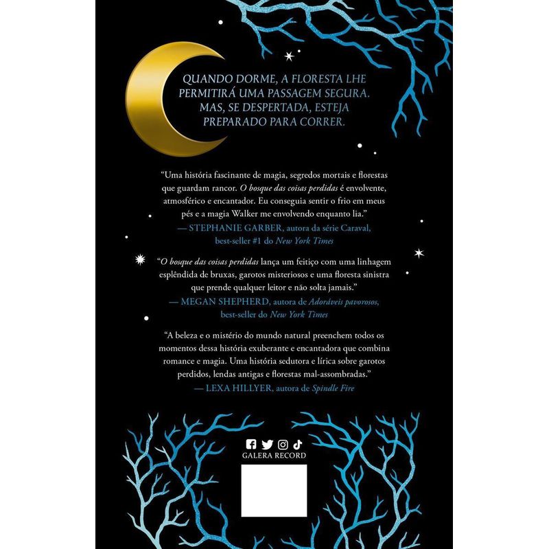 Quando dorme, a floresta lhe permitirá uma passagem segura. Mas, se despertada, esteja preparado para correr! Envolvente e sorrateiro, O bosque das coisas perdidas vai te seduzir com magia e mistérios até que você esteja embrenhado demais em suas páginas para conseguir largar. Desde os primórdios dos contos de fadas somos ensinados a temer o que se esconde nas florestas escuras, e as florestas que cercam a cidadezinha de Fir Haven são ainda mais sinistras. Alguns dizem que aquelas árvores são mágicas. Outros, que são assombradas. Quando dorme, a floresta lhe permitirá uma passagem segura. Mas, se despertada, esteja preparado para correr.Nora Walker vem de uma longa linhagem de bruxas naturais que compartilham uma conexão especial com o Bosque de Vime e é essa conexão que a leva até Or Huntsman, o garoto que desapareceu durante a pior nevasca dos últimos anos. Ele deveria estar morto, mas foi encontrado vivo na floresta, sem qualquer lembrança do que aconteceu enquanto esteve desaparecido.Mas Nora pode sentir a presença de Or despertando a floresta, e não demora até perceber que, para manter as árvores adormecidas, ela precisará descobrir como o garoto a quem se apegou tão profundamente sobreviveu na floresta, e o que o levou até lá em primeiro lugar. O que Nora não sabe, porém, é que Or tem os próprios segredos — segredos que fará de tudo para manter ocultos, porque parece que ele não foi o único a desaparecer naquela fatídica noite, duas semanas atrás…A autora de A maldição do mar está de volta com um romance assombrado em que contos de fadas sombrios e bosques encantados se misturam depois que um garoto dado como desaparecido é encontrado na floresta mágica e se apaixona pela bruxa determinada a desvendar seus segredos. “Uma história fascinante de feitiçaria, segredos mortais e florestas que guardam rancor. O bosque das coisas perdidas é envolvente, atmosférico e encantador. Eu conseguia sentir o frio em meus pés e a magia Walker me envolvendo enquanto lia.” — Stephanie Garber, autora da série Caraval, best-seller internacional e #1 da lista do New York Times“O bosque das coisas perdidas lança um feitiço com uma linhagem esplêndida de bruxas, meninos misteriosos e uma floresta sinistra que prende qualquer leitor e não solta jamais.” — Megan Shepherd, autora de Adoráveis Pavorosos, best-seller da lista do New York Times “Um mistério se desenrola em um ritmo acelerado entre adolescentes sem supervisão, e o perverso e assombroso Bosque de Vime é caracterizado de maneira adorável, e é tão envolvente quanto a formidável heroína… Uma experiência deliciosamente imersiva e arrepiante.” — Kirkus Reviews