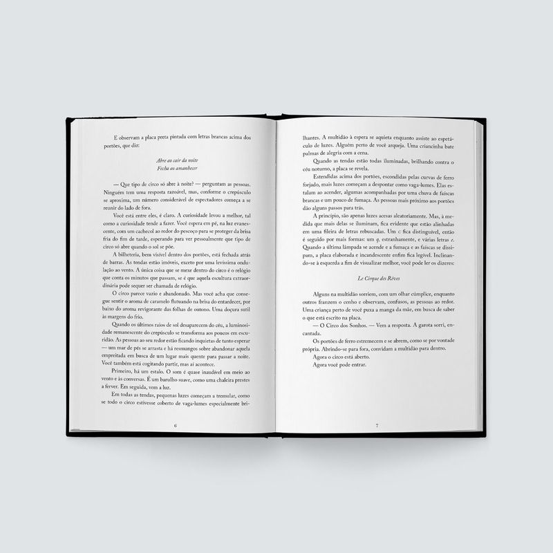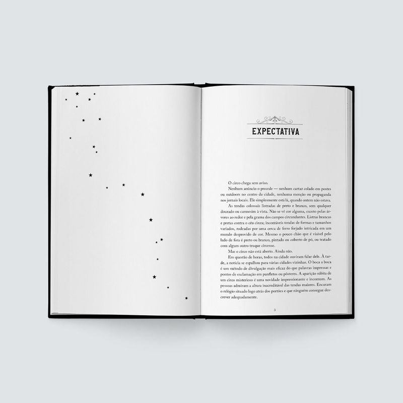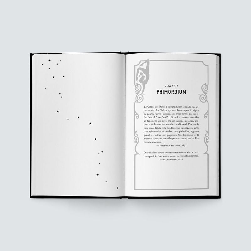 O circo chega sem aviso… Simplesmente está lá, quando ontem não estava. Contra o céu cinza pairam tendas colossais listradas de preto e branco. Um aviso pendurado acima dos portões diz: Abre ao cair da noite Fecha ao amanhecer Quando os últimos raios de sol desaparecem do céu, pequenas luzes começam a tremular em meio às tendas, como se todo o circo estivesse coberto de vaga-lumes. Quando as tendas estão todas iluminadas, brilhando contra o céu noturno, a placa se revela: Le Cirque des Rêves O Circo dos Sonhos Os portões de ferro estremecem e se abrem, como se por vontade própria. Abrindo-se para fora, convidam a multidão para dentro. Agora o circo está aberto. Agora você pode entrar.