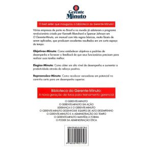 “Este livro revoluciona o conceito de liderança e inaugura a série Gerente-Minuto, destinada a tornar cada vez mais simples e eficaz a prática administrativa. Várias empresas de porte no Brasil e no mundo já adotaram o programa revolucionário criado por Kenneth Blanchard e Spencer Johnson em O Gerente-Minuto, um manual de três regras básicas, muito fáceis de serem aplicadas, que produzem excelentes resultados em um curto espaço de tempo… Objetivos-Minuto: como estabelecer objetivos e padrões de desempenho e fornecer o feedback de que seus funcionários precisam para realizar suas tarefas melhor; Elogios-Minuto: como obter um alto nível de desempenho e aumentar a produtividade através do reforço positivo; Repreensões-Minuto: como recolocar vencedores em potencial no caminho certo para um desempenho superior. “