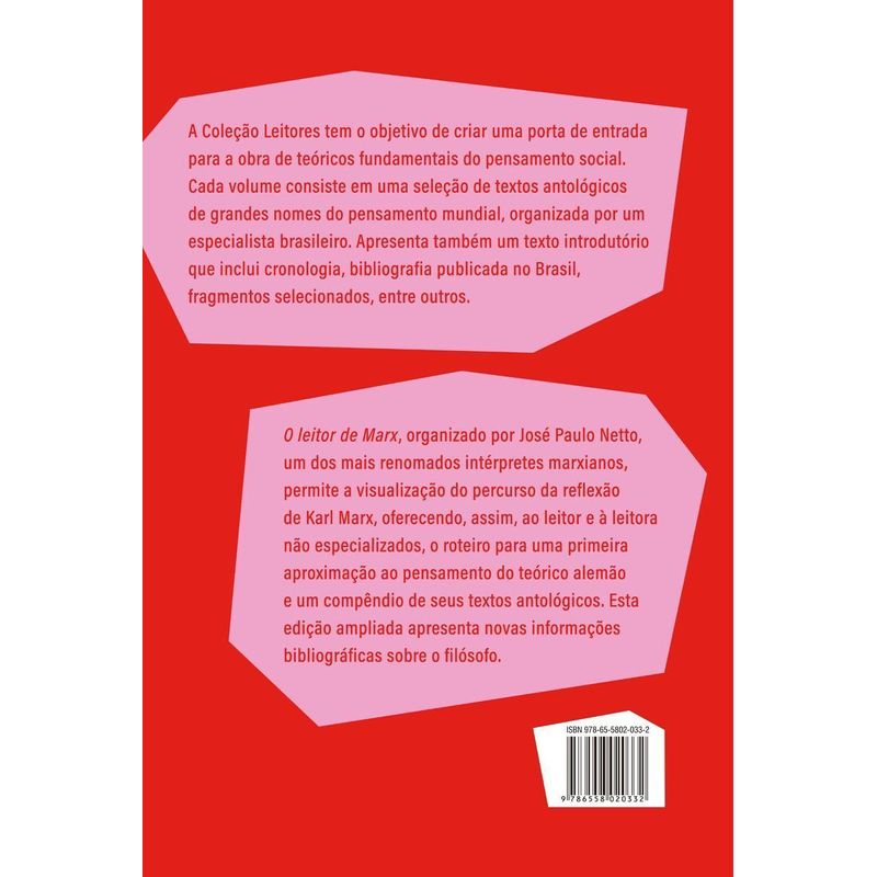 Antologia de Marx comentada pelo seu grande biográfo brasileiro. O leitor de Marx, organizado por José Paulo Netto – um dos maiores especialistas em Marx na atualidade – reúne um conjunto de textos, fiel à ordem cronológica da produção marxiana, que resgata os marcos essenciais de sua elaboração, no complexo processo em que seus pontos de partida filosóficos confluem em direção a seu objetivo teórico principal: a crítica da economia política.A obra de Karl Marx, por sua significação teórica, é uma referência na cultura do Ocidente e, por seu impacto histórico-social, adquiriu relevância em todo o globo. Marx instaurou as bases de uma teoria da sociedade burguesa que, nucleada por uma ontologia social fundada no trabalho, diz respeito à natureza, à estrutura e à dinâmica da sociedade em que vivemos. A investigação a que dedicou toda a vida foi norteada pelo intuito de subsidiar a ação revolucionária dos trabalhadores, cujo objetivo — para Marx, a emancipação humana — supõe a ultrapassagem da ordem societária comandada pelo capital.Teórico e homem de ação, pesquisador e militante, Marx vem sendo invocado, por mais de um século, pela maioria daqueles que se empenham na crítica radical da sociedade burguesa, em processos prático-políticos de libertação nacional e em projetos de construção socialista. Intelectuais de várias gerações pautaram suas reflexões inspirados nele, e homens e mulheres dos mais diversos quadrantes já protagonizaram combates e experiências em nome de suas ideias — ou de ideias a ele atribuídas, uma vez que seu legado foi objeto de múltiplas interpretações, vulgarizações e deformações.O leitor de Marx permite a visualização do percurso da reflexão de Karl Marx, oferecendo, assim, ao leitor e à leitora não especializados, o roteiro para uma primeira aproximação ao pensamento do teórico Marx e um compêndio de textos antológicos do pensador alemão. Esta edição ampliada apresenta novas informações bibliográficas sobre o filósofo.O volume faz parte da Coleção Leitores, que tem o objetivo de criar uma porta de entrada para a obra de teóricos fundamentais do pensamento social. Cada volume consiste em uma seleção de textos antológicos de grandes nomes do pensamento mundial, organizada por um especialista brasileiro. Apresenta também um texto introdutório que inclui cronologia, bibliografia publicada no Brasil, fragmentos selecionados, entre outros.