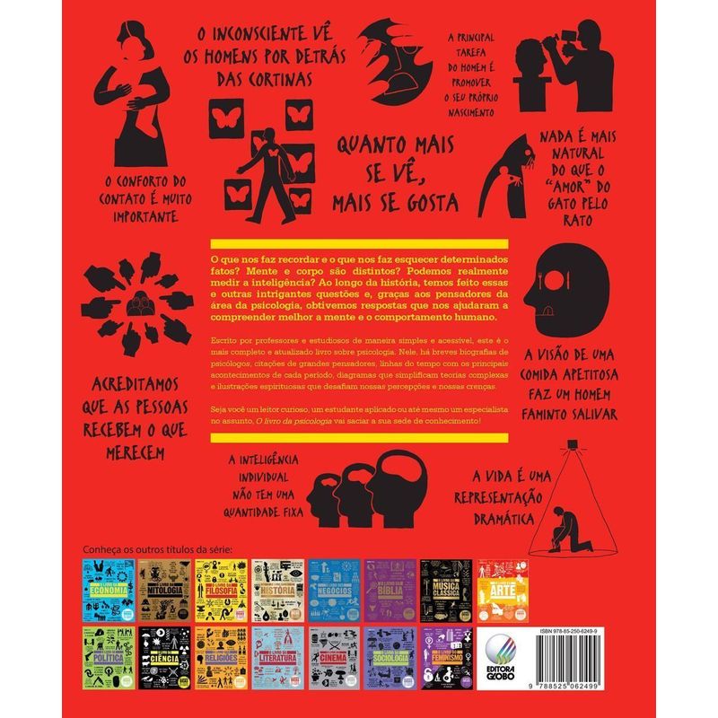Seja ao candidatar-se a um novo emprego, buscar apoio para fobias ou compulsões, receber orientação sobre como melhorar o desempenho dos filhos na escola, a aplicação dos estudos da psicologia acompanham decisões e comportamentos a todo momento. Apesar disto, esta ciência ainda é uma área do conhecimento misteriosa para muitas pessoas. Muito além dos estudos de Freud e Jung, O livro da psicologia traz um panorama completo e detalhado sobre essa ciência da mente e do comportamento. Nele, a psicologia é abordada a partir de suas raízes filosóficas (desde as reflexões feitas por Descartes, ponto de partida da noção fundamental de subjetividade) e fisiológicas (com destaque para o neurologista francês Jean-Martin Charcot e seu diagnóstico dos mecanismos causadores da histeria). O entrelaçar dessas duas áreas permitiu que, em 1879, fosse dado o primeiro passo para a constituição da psicologia como ciência por meio da criação por Wilhelm Wundt do primeiro laboratório de psicologia experimental na Universidade de Leipzig, na Alemanha. O livro da psicologia, lançamento da Globo Livros, segue a mesma proposta de conteúdo e projeto gráfico de O livro da filosofia, obra que permanece há mais de 20 semanas na lista brasileira dos livros mais vendidos de não ficção. Seguido de uma perspectiva cronológica, e com o apoio de esquemas e gráficos, a publicação destaca autores e contextualiza suas descobertas, traz um glossário com os principais termos e teorias, além de conter um capítulo dedicado a apresentar os cientistas e psicólogos que ajudaram a aprofundar o conhecimento desenvolvido ao longo das décadas. O livro da psicologia é o mais atualizado livro sobre o tema, uma obra que despertará reflexões, destruirá preconceitos e instigará o leitor a buscar o autoconhecimento.