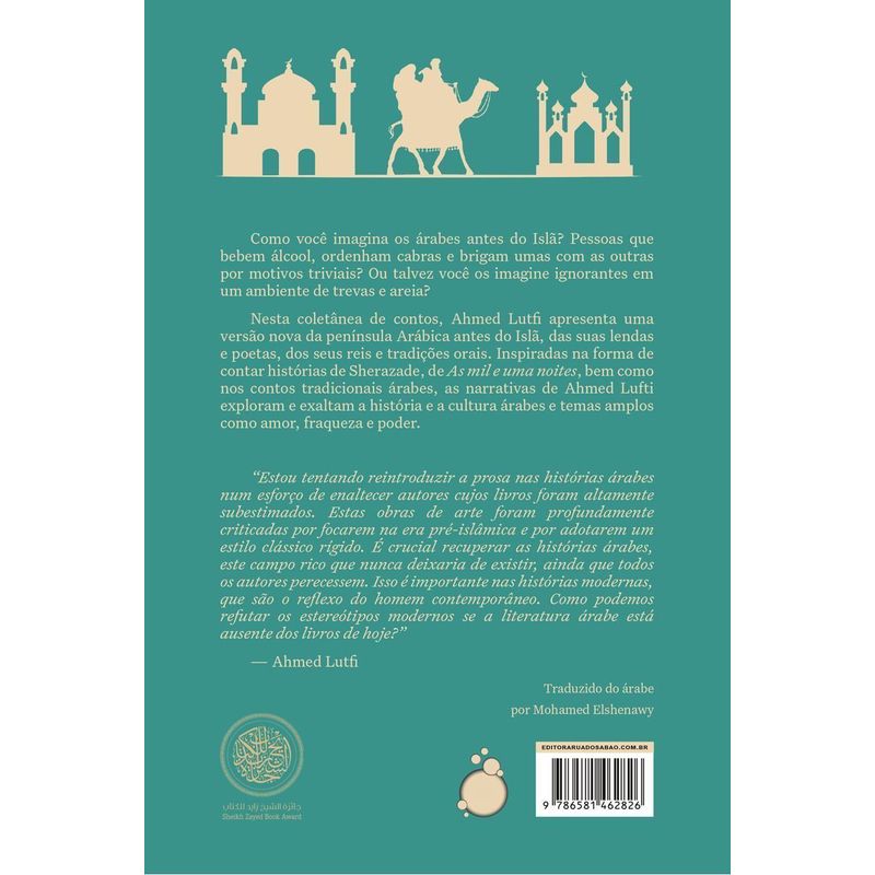 Como você imagina os árabes antes do Islã? Pessoas que bebem álcool, ordenham cabras e brigam umas com as outras por motivos triviais? Ou talvez você os imagine ignorantes em um ambiente de trevas e areia? Nesta coletânea de contos, Ahmed Lutfi apresenta uma versão nova da península Arábica antes do Islã, das suas lendas e poetas, dos seus reis e tradições orais. Inspiradas na forma de contar histórias de Sherazade, de As mil e uma noites, bem como nos contos tradicionais árabes, as narrativas de Ahmed Lufti exploram e exaltam a história e a cultura árabes e temas amplos como amor, fraqueza e poder. “Estou tentando reintroduzir a prosa nas histórias árabes num esforço de enaltecer autores cujos livros foram altamente subestimados. Estas obras de arte foram profundamente criticadas por focarem na era pré-islâmica e por adotarem um estilo clássico rígido. É crucial recuperar as histórias árabes, este campo rico que nunca deixaria de existir, ainda que todos os autores perecessem. Isso é importante nas histórias modernas, que são o reflexo do homem contemporâneo. Como podemos refutar os estereótipos modernos se a literatura árabe está ausente dos livros de hoje?” — Ahmed Lutfi Traduzido do árabe por Mohamed Elshenawy
