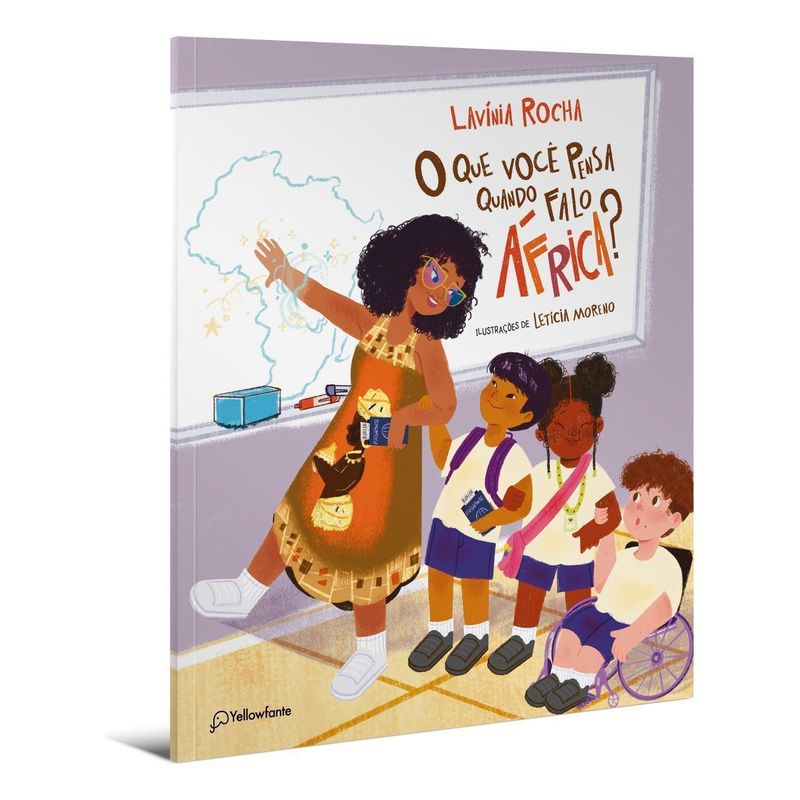 No final de 2022, a professora e escritora Lavínia Rocha postou um vídeo mostrando um “antes e depois” que fez com seus alunos do 5º ano ao ensiná-los sobre África, uma postagem que viralizou e mudou completamente a sua vida profissional. Antes de iniciar o projeto, ela perguntou aos alunos o que associavam ao continente africano, e as poucas respostas vieram impregnadas de estereótipos e ideias pré-concebidas (e muitas vezes incorretas) sobre aquele território. Meses depois, ao fim do ensino do conteúdo, a professora repetiu a dinâmica, e o que pudemos ver foi uma enorme gama de termos diversos que de fato representam a África em sua multiplicidade. Este projeto de livro ilustrado, intitulado “O que você pensa quando falo África?”, escrito pela autora e professora Lavínia Rocha e ilustrado por Letícia Moreno, ficcionaliza o episódio sob a perspectiva dos alunos conforme eles vão adquirindo conhecimentos fascinantes sobre um continente antes tão desconhecido.