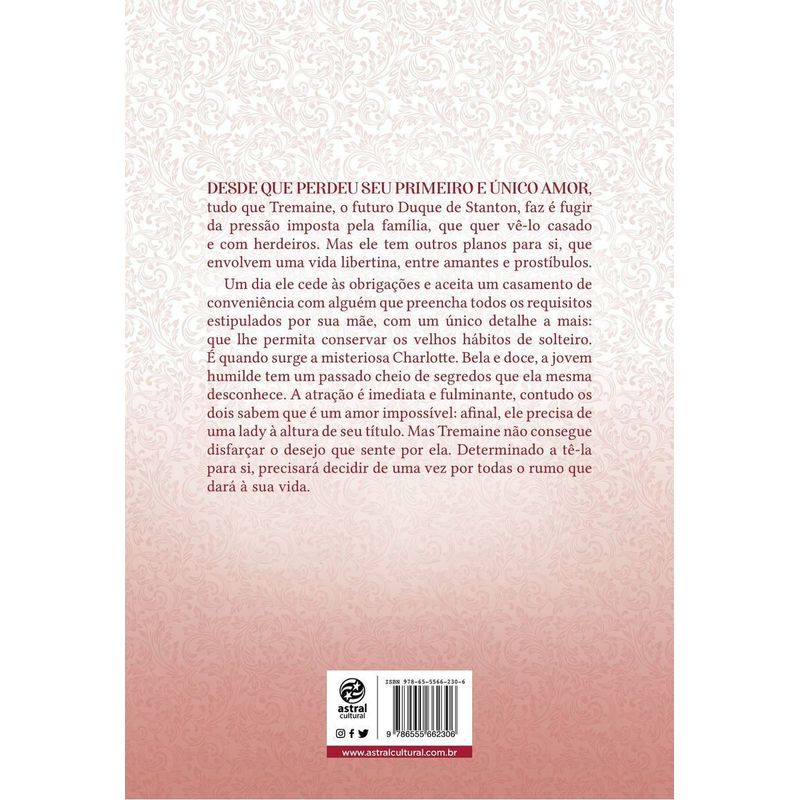 LIVRO III da série Poderoso Destino Tudo que Tremaine, o futuro Duque de Stanton, faz desde que perdeu seu primeiro e único amor é fugir da pressão imposta pela família, que quer vê-lo casado e com herdeiros. Mas ele tem outros planos para si, que envolvem uma vida libertina, entre amantes e prostíbulos. Um dia ele cede às obrigações, e aceita um casamento de conveniência com alguém que preencha todos os requisitos estipulados por sua mãe, com um único detalhe a mais: que lhe permita conservar os velhos hábitos de solteiro. É quando surge a misteriosa Lottie. Bela e doce, a jovem humilde tem um passado cheio de segredos que ela mesma desconhece. A atração é imediata e fulminante, contudo os dois sabem que é um amor impossível: afinal, ele precisa de uma Lady à altura de seu título. Mas Tremaine não consegue disfarçar o desejo que sente por ela. Determinado a tê-la para si, precisará decidir de uma vez por todas o rumo que dará à sua vida.