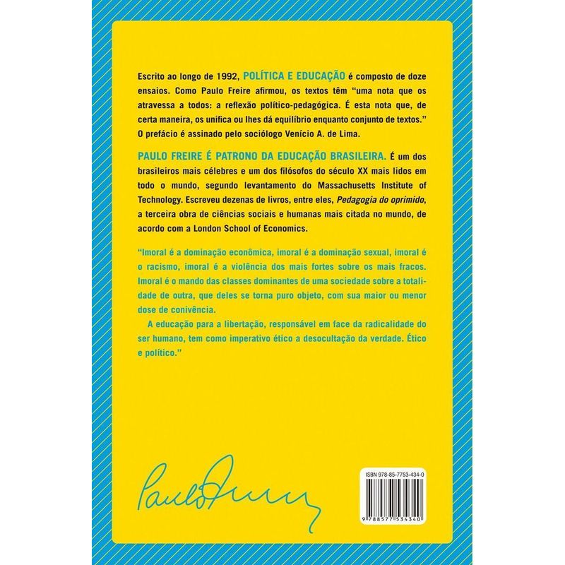 Ensaios de Paulo Freire sobre política e pedagogia. Escrito ao longo de 1992, Política e educação é composto de doze ensaios. Como Paulo Freire afirmou, os textos têm “uma nota que os atravessa a todos: a reflexão político-pedagógica. É esta nota que, de certa maneira, os unifica ou lhes dá equilíbrio enquanto conjunto de textos.” O prefácio é assinado pelo sociólogo Venício A. de Lima.Ao longo de sua história, Paulo Freire recebeu mais de cem títulos de doutor honoris causa, de diversas universidades nacionais e estrangeiras, além de inúmeros prêmios, como Educação para a Paz, da Unesco, e Ordem do Mérito Cultural, do governo brasileiro. Integra o International Adult and Continuing Education Hall of Fame e o Reading Hall of Fame.“Imoral é a dominação econômica, imoral é a dominação sexual, imoral é o racismo, imoral é a violência dos mais fortes sobre os mais fracos. Imoral é o mando das classes dominantes de uma sociedade sobre a totalidade de outra, que deles se torna puro objeto, com sua maior ou menor dose de conivência. A educação para a libertação, responsável em faze da radicalidade do ser humano, tem como imperativo ético a desocultação da verdade. Ético e político.”