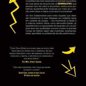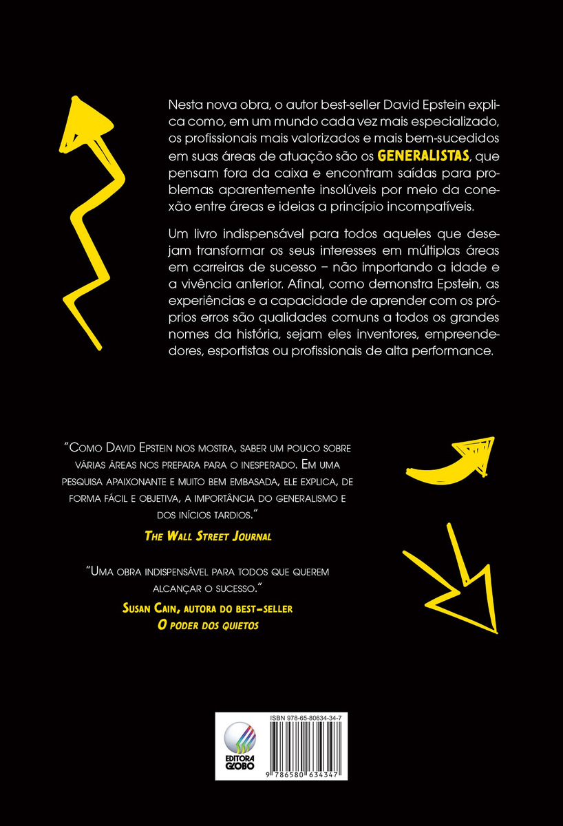 O livro de negócios mais celebrado no mundo chega ao Brasil David Epstein explica, em Por que os generalistas vencem em um mundo de especialistas, como, em um mundo cada vez mais especializado, os profissionais mais valorizados e mais bem-sucedidos em suas áreas de atuação são os generalistas, aqueles que pensam fora da caixa e encontram saídas para problemas aparentemente insolúveis por meio da conexão entre áreas e ideias, a princípio, incompatíveis. Por que os generalistas vencem em um mundo de especialistas é um livro indispensável para todos aqueles que desejam transformar os seus interesses em múltiplas áreas em carreiras de sucesso – não importando a idade e a vivência anterior. Afinal, as experiências e a capacidade de aprender com os próprios erros são qualidades comuns a todos os grandes nomes da história, sejam eles inventores, empreendedores, esportistas ou profissionais de alta performance.