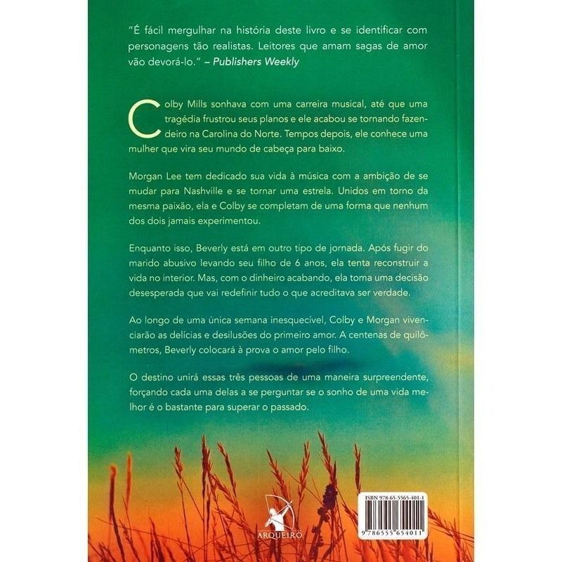 “É fácil mergulhar na história deste livro, se identificando com personagens tão realistas. Leitores que amam sagas de amor épico vão querer devorá-lo.” – Publishers Weekly Nicholas Sparks já vendeu mais de 150 milhões de livros no mundo. Colby Mills sonhava com uma carreira musical, até que uma tragédia frustrou seus planos e ele acabou se tornando fazendeiro na Carolina do Norte. Tempos depois, ele resolve dar um intervalo nas tarefas cotidianas e vai fazer alguns shows em um bar de praia na Flórida. E lá Colby conhece uma mulher que vira seu mundo de cabeça para baixo. Morgan Lee tem dedicado sua vida à música com a ambição de se mudar para Nashville e se tornar uma estrela. Unidos em torno da mesma paixão, ela e Colby se completam de uma forma que nenhum deles jamais experimentou. Enquanto isso, Beverly está em outro tipo de jornada. Após fugir do marido abusivo com seu filho de 6 anos, ela tenta reconstruir a vida no interior. Mas, com o dinheiro acabando e o perigo se aproximando, ela toma uma decisão desesperada que irá redefinir tudo o que acreditava ser verdade. Ao longo de uma única semana inesquecível, Colby e Morgan vivenciarão as delícias e desilusões do primeiro amor. A centenas de quilômetros, Beverly colocará à prova o amor pelo filho. O destino unirá essas três pessoas de uma maneira surpreendente, forçando cada uma a se perguntar se o sonho de uma vida melhor é o bastante para superar o passado.
