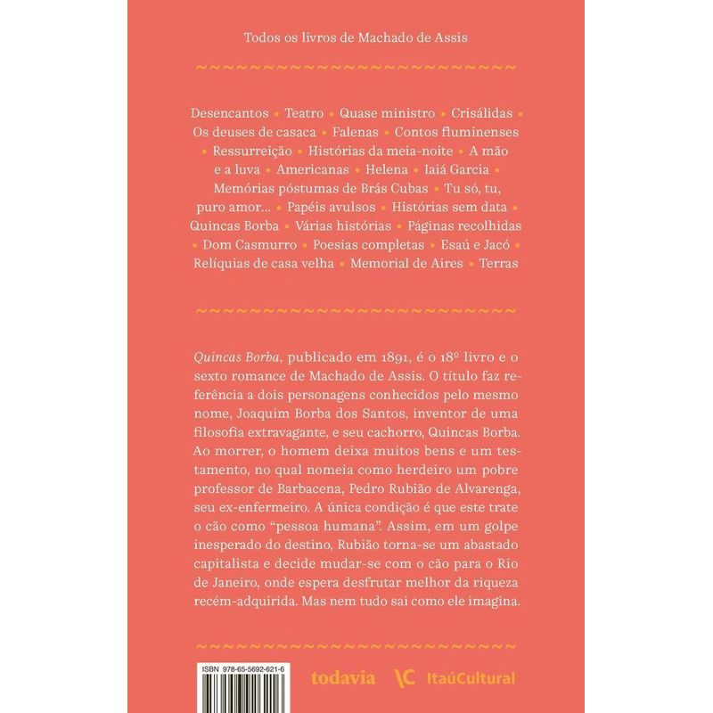 É o 18º livro e o sexto romance de Machado de Assis. O título faz referência a dois personagens conhecidos pelo mesmo nome, Joaquim Borba dos Santos, inventor de uma filosofia extravagante, e seu cachorro, Quincas Borba. Ao morrer, o homem deixa muitos bens e um testamento, no qual nomeia como herdeiro um pobre professor de Barbacena, Pedro Rubião de Alvarenga, seu ex-enfermeiro. A única condição é que este trate o cão como “pessoa humana”. Assim, em um golpe inesperado do destino, Rubião torna-se um abastado capitalista e decide mudar-se com o cão para o Rio de Janeiro, onde espera desfrutar melhor da riqueza recém-adquirida. Mas nem tudo sai como ele imagina