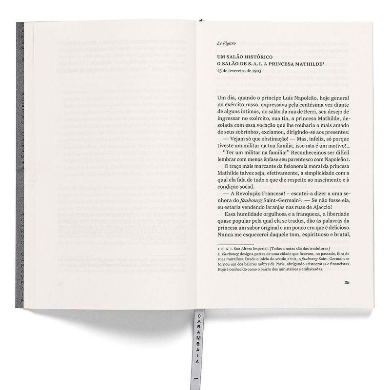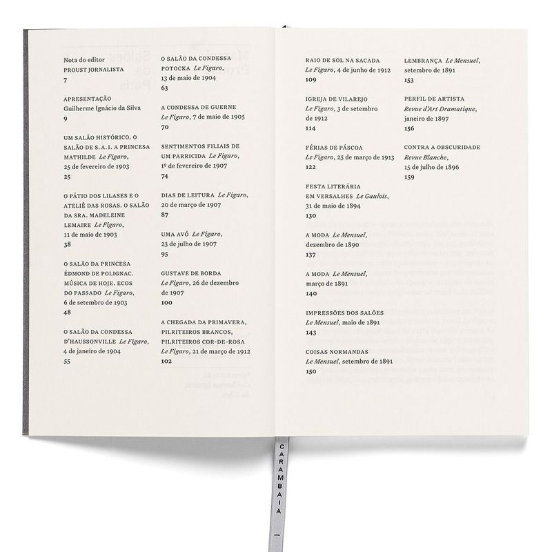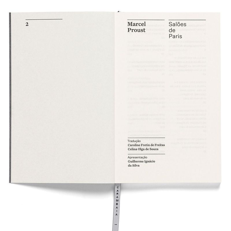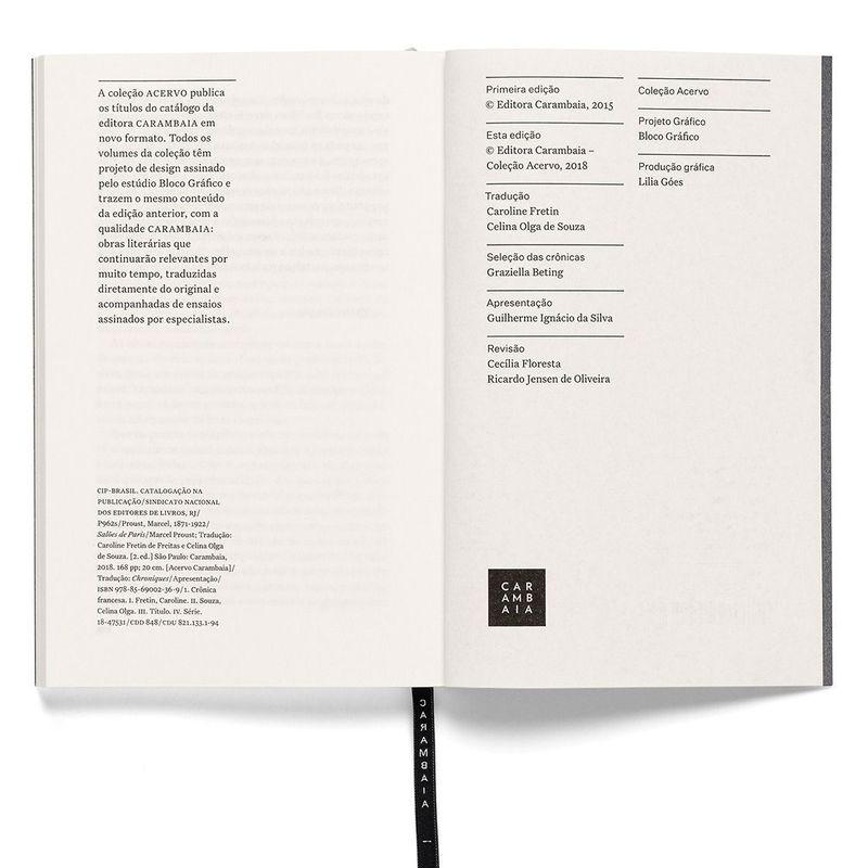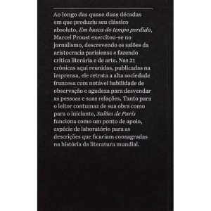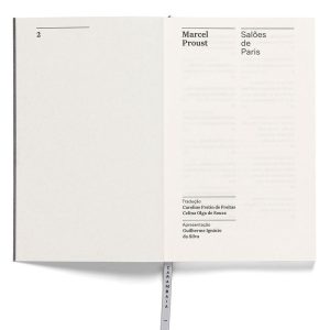 Antes de se tornar o autor consagrado de “Em busca do tempo perdido”, Marcel Proust, como tantos escritores de sua época, passou pelo jornalismo. Foi nos periódicos franceses que publicou seus primeiros textos: crônicas em que descreve os salões parisienses – espécies de saraus literários e musicais, frequentados por aristocratas e gente da alta sociedade da época –, críticas de moda, arte e literatura, além de textos inspirados na atualidade política e até policial. “Salões de Paris” traz uma seleção de 21 crônicas escritas por Proust e publicadas na imprensa francesa, principalmente no jornal Le Figaro, mas também em periódicos de curta duração como o “Le Mensuel” (que circulou entre outubro de 1890 e setembro de 1891) ou revistas especializadas, como a “Revue d’Art Dramatique” (1886-1909) ou a Revue Blanche (1889-1903). O design da coleção é assinado pelo Bloco Gráfico, constituído por Gabriela Castro, Gustavo Marchetti e Paulo André Chagas. Os livros têm acabamento em brochura, formato 13×20 cm, e utilizam papéis especiais e certificados: o sueco Munken Print Cream 80 g/m2 no miolo e o escocês Pop Set Black 320 g/m2 na capa. Outro detalhe do volume é a inclusão de um fitilho bordado com o logo do Acervo.