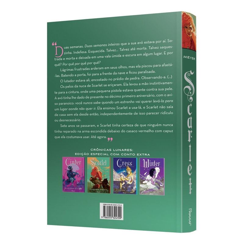 EDIÇÃO ESPECIAL COM CONTO EXTRA. Duas semanas. Duas semanas inteiras que a sua avó estava por aí. Sozinha. Indefesa. Esquecida. Talvez… Talvez até morta. Talvez sequestrada e morta e deixada em uma vala úmida e escura em algum lugar. E por quê? Por quê por quê por quê? Lágrimas frustradas arderam em seus olhos, mas ela piscou para afastá-las. Batendo a porta, foi para a frente da nave e ficou paralisada. O lutador estava ali, encostado no prédio de pedra. Observando-a. (…) Os pelos da nuca de Scarlet se eriçaram. Ela levou a mão instintivamente para a cintura, onde uma pequena pistola estava quente contra sua pele. A avó tinha lhe dado de presente no décimo primeiro aniversário, com o aviso paranoico: você nunca sabe quando um estranho vai querer levá-la para um lugar aonde não quer ir. Ela ensinou Scarlet a usa-lá, e Scarlet não saía de casa sem ela desde então, independentemente de isso parecer ridículo ou desnecessário. Sete anos se passaram, e Scarlet tinha certeza de que ninguém nunca tinha reparado na arma escondida debaixo do casaco vermelho com capuz que ela costumava usar. Até agora. Cinder, a ciborgue mecânica, retorna neste segundo volume da emocionante série Crônicas Lunares. Ela está tentando a todo custo escapar da prisão — embora, se seu plano der certo, possa acabar se tornando a fugitiva mais procurada do mundo. Quase do outro lado do globo, Michelle Benoit desapareceu. Enquanto investiga seu paradeiro, sua neta Scarlet descobre que há muitas coisas que não sabe sobre a avó e que durante toda a sua vida correu um grande perigo. É então que ela conhece Lobo, um lutador de rua que pode ter informações sobre o desaparecimento de Michelle. Apesar de sua relutância em confiar no estranho, de um jeito inexplicável, ela acaba se sentindo atraída por ele… e Lobo por ela. Em busca de pistas para desvendar esse mistério, Scarlet e Lobo se deparam com um enigma ainda maior ao conhecerem Cinder. Agora, o trio precisa se manter um passo à frente de Levana, a perversa rainha lunar, que vai fazer de tudo para que o príncipe Kai se torne seu marido, seu rei e seu prisioneiro.
