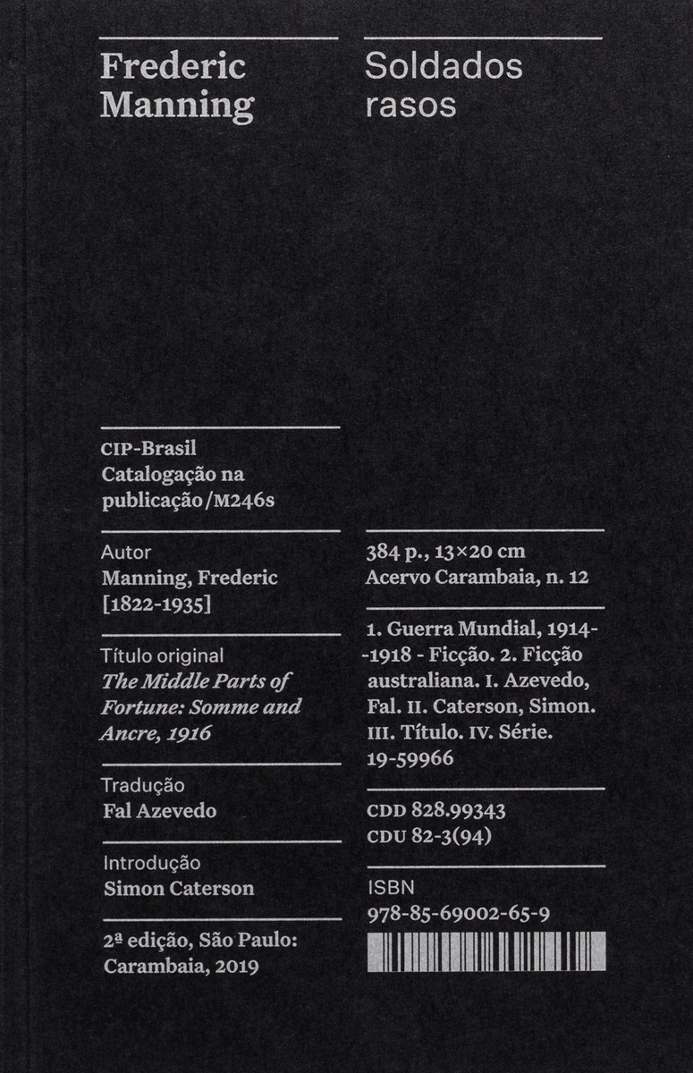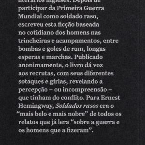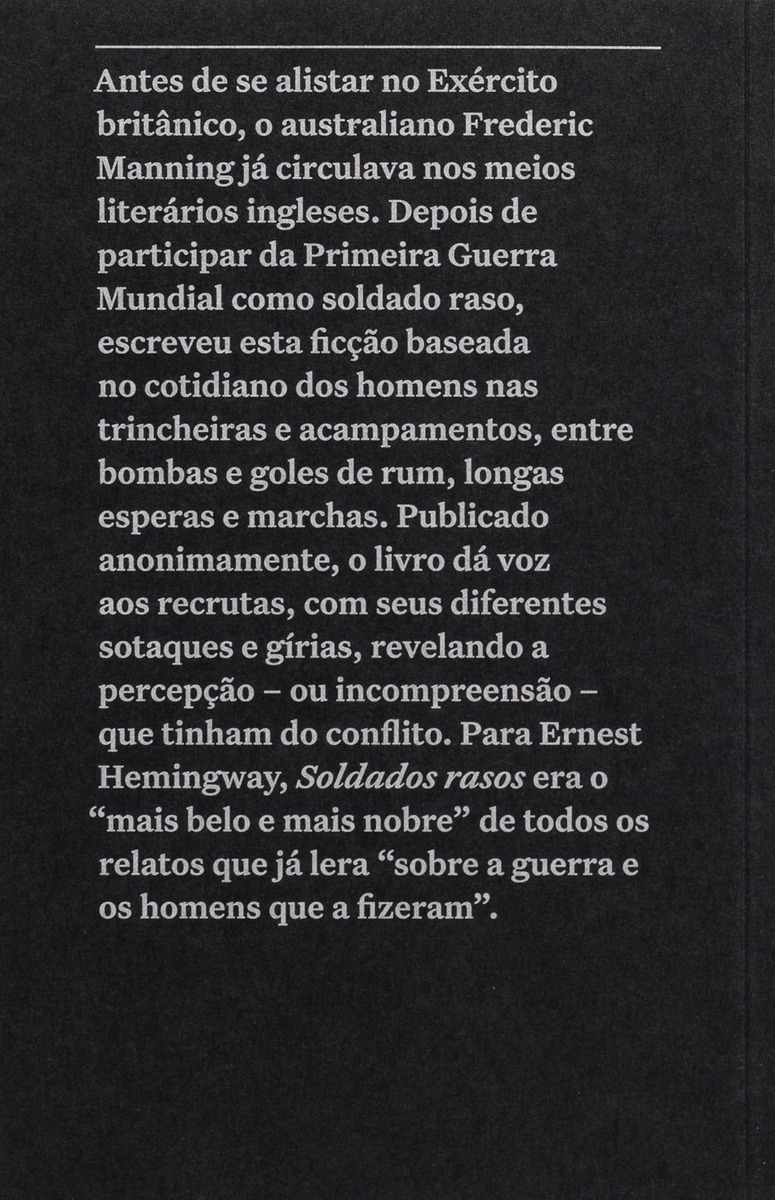 “Soldados rasos”, inédito no Brasil, foi publicado pela primeira vez na Inglaterra em 1929, em uma edição com tiragem reduzida e, no ano seguinte, em maior tiragem, mas numa versão com cortes, livre de palavrões e demais expressões consideradas chocantes para a época. O livro, que logo chamou atenção pela qualidade literária do relato de guerra, foi publicado anonimamente. Vinha apenas com a assinatura “Soldado 19022”. Leitores intrigados com a autoria do texto acabaram descobrindo que quem estava por trás daquelas linhas era o escritor australiano Frederic Manning (1882-1935). O pseudônimo referia-se à identificação militar que recebeu quando lutou pela Inglaterra durante a Primeira Guerra Mundial. Conhecido nos círculos literários da Inglaterra, onde vivia, Manning alistou-se voluntariamente no exército britânico e lutou, ao lado de soldados de diversas nacionalidades, nas ofensivas franco-britânicas contra os alemães na região do vale dos rios Somme e Ancre, na França, durante o segundo semestre de 1916. Seu livro é uma ficção baseada no cotidiano dos homens nas trincheiras e acampamentos, entre bombas e goles de rum, longas esperas e marchas. Manning dá voz aos soldados anônimos, com seus diferentes sotaques e gírias, revelando a percepção – ou incompreensão – que tinham do conflito. O sucesso do livro na Inglaterra fez autores e críticos investigarem a identidade do Soldado 19022. Foi T. E. Lawrence, apreciador da escrita de Manning e que considerava a obra “o livro dos livros” sobre o exército britânico, quem a desvendou e forçou o autor a sair do anonimato. Cultuado por escritores como Ezra Pound, T. S. Eliot ou E. M. Forster, “Soldados rasos” só foi relançado em sua versão completa na Inglaterra no final dos anos 1970. Essa foi a edição usada como base para a primeira tradução da obra para o português. Ernest Hemingway declarou certa vez que considerava o livro de Manning como o “mais belo e mais nobre” de todos os que já lera “sobre a guerra e os homens que a fizeram”. “Eu o releio a cada ano, para me lembrar de como as coisas realmente eram, para não ter nunca de mentir – a mim mesmo ou aos outros – sobre o que foi essa realidade”, disse.