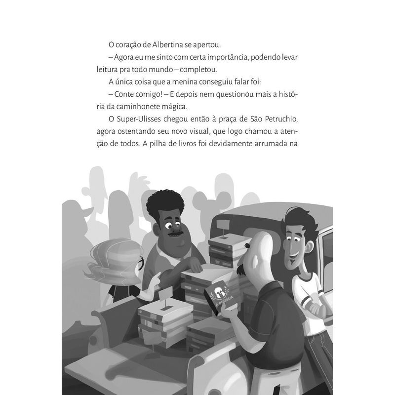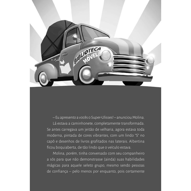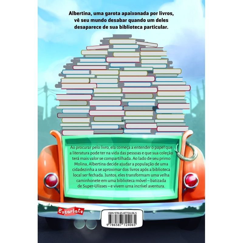 Albertina ama ler. Ama, especialmente, os seus livros. Seus 244 livros, nem um a mais, nem um a menos. Certo dia, no entanto, as obras somem do seu quarto. O que teria acontecido? Furiosa, ela descobriu que seus pais haviam levado seus preciosos companheiros para o café da família. E – pior – um dos livros tinha sumido dali! Na busca para encontrar a obra, sua preferida, Albertina contando com a ajuda de Molina e da caminhonete Ulisses, conhece Zezo e Jonas. Juntos descobrem que o poder das histórias está justamente no que elas podem fazer pelas pessoas quando estão fora das estantes, circulando por aí. Para o leitor mais experiente, essa obra de Caio Tozzi é uma deliciosa metáfora sobre o poder transformador da literatura.