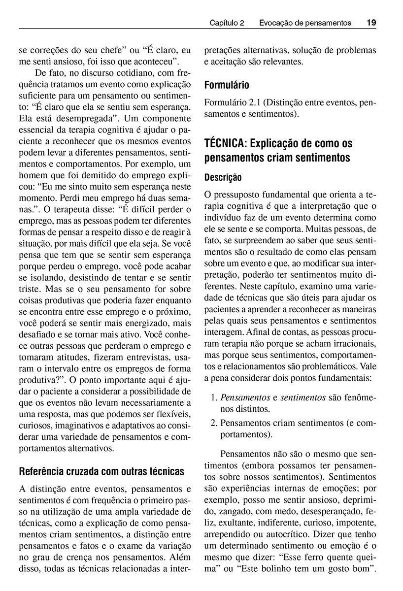 Esta nova edição de Técnicas de terapia cognitiva reúne ferramentas fundamentais para a prática clínica. Robert L. Leahy, autor consagrado na área, descreve de forma clara e acessível maneiras de auxiliar os pacientes a identificar e a modificar pensamentos problemáticos, crenças centrais e padrões de preocupação, autocrítica e busca por aprovação, bem como aborda como avaliar esquemas pessoais, lidar com emoções dolorosas e tomar decisões com foco em objetivos. Cada técnica apresentada inclui exemplos de casos e diálogos entre terapeuta e paciente.