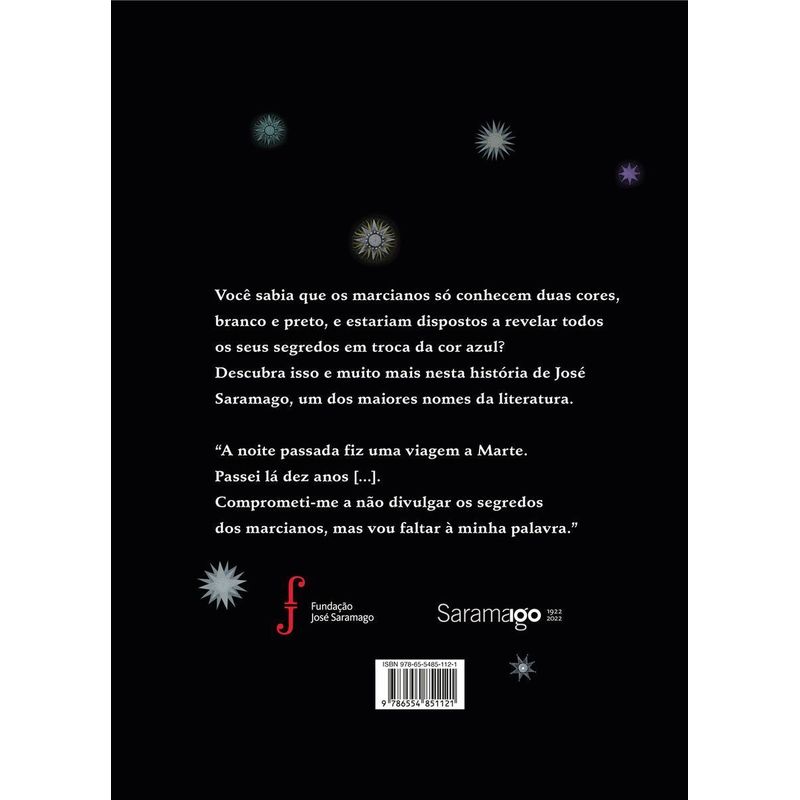 Nesta história para leitores de todas as idades, a escrita incomparável de José Saramago nos transporta em uma viagem espacial até uma utopia em Marte. O narrador desta história quebra a promessa de manter segredo e nos conta sobre sua incrível jornada extraterrestre. Em sua viagem espacial, ele foi parar em Marte e, durante sua estadia no planeta, observou que os habitantes de lá viviam em paz e harmonia, sem guerras. Porém, lá só existiam duas cores: o branco e o preto, e suas gradações de tonalidades. Foi então que lhe surgiu uma ideia: e se os marcianos concordassem em trocar seus valiosos saberes por uma chance de conhecer as cores do planeta Terra? Com sua habilidade única de criar e brincar com palavras e ideias, Saramago constrói um paralelo utópico entre Marte e a Terra, comparando os nossos modos humanos de viver com os dos marcianos. Ao levar os leitores para um novo mundo, o consagrado autor os convida a refletir sobre seu próprio planeta. Para tornar a viagem ainda mais palpável, as ilustrações da premiada artista argentina Claudia Legnazzi trazem um toque original ao conto, dando vida e personalidade à civilização alienígena. Indicado para leitores a partir de 9 anos.