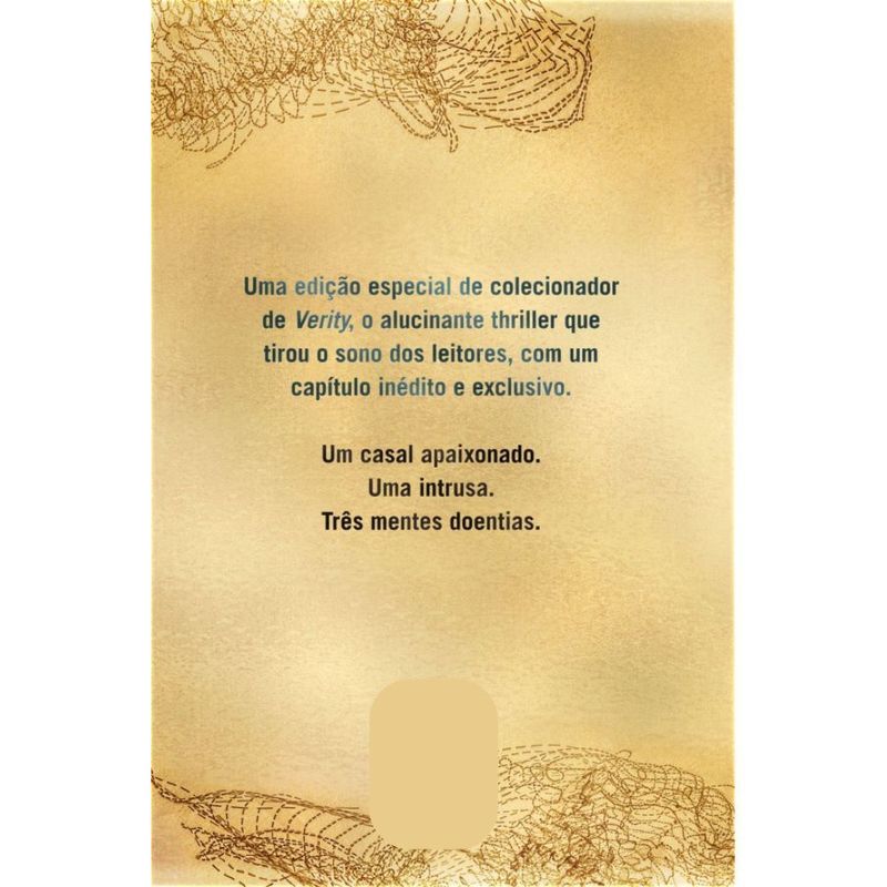 Um casal apaixonado. Uma intrusa. Três mentes doentias. Agora em uma edição especial de colecionador com capítulo extra inédito, conheça o thriller de estreia de Colleen Hoover, que se tornou um fenômeno editorial e best-seller mundial. Verity Crawford é a autora best-seller por trás de uma série de sucesso. Ela está no auge de sua carreira, aclamada pela crítica e pelo público, no entanto, um súbito e terrível acidente acaba interrompendo suas atividades, deixando-a sem condições de concluir a história… E é nessa complexa circunstância que surge Lowen Ashleigh, uma escritora à beira da falência convidada a escrever, sob um pseudônimo, os três livros restantes da já consolidada série. Para que consiga entender melhor o processo criativo de Verity com relação aos livros publicados e, ainda, tentar descobrir seus possíveis planos para os próximos, Lowen decide passar alguns dias na casa dos Crawford, imersa no caótico escritório de Verity – e, lá, encontra uma espécie de autobiografia onde a escritora narra os fatos acontecidos desde o dia em que conhece Jeremy, seu marido, até os instantes imediatamente anteriores a seu acidente – incluindo sua perspectiva sobre as tragédias ocorridas às filhas do casal. Quanto mais o tempo passa, mais Lowen se percebe envolvida em uma confusa rede de mentiras e segredos, e, lentamente, adquire sua própria posição no jogo psicológico que rodeia aquela casa. Emocional e fisicamente atraída por Jeremy, ela precisa decidir: expor uma versão que nem ele conhece sobre a própria esposa ou manter o sigilo dos escritos de Verity? Em Verity, Colleen Hoover se afasta do estilo que a consagrou, os romances, para se aventurar em um suspense psicológico que deixou todo o mercado editorial sem palavras de tão avassalador. Através de uma narrativa perturbadora e chocante, Verity explora o lado mais sombrio das relações humanas, com direito a uma surpresa chocante no final. Classificação etária: 18 anos.